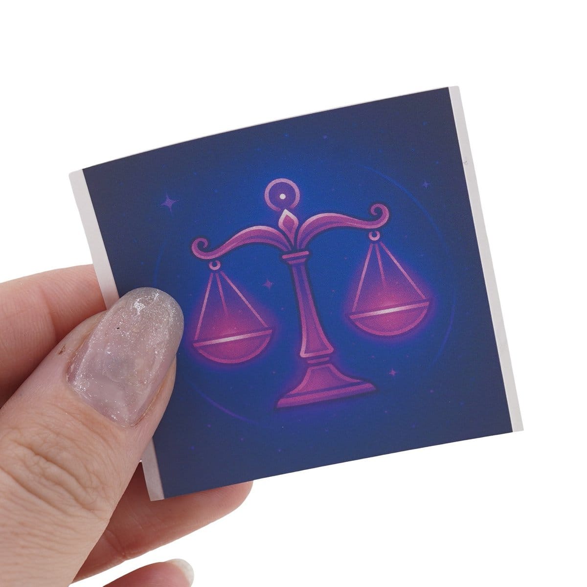 Abtibildul sticker cu zodia Balanța, cu dimensiunea de 51 mm, este creat pentru tine dacă îți dorești un mic simbol personal pe care să îl ai mereu aproape. Designul său pătrat, în nuanțe de albastru și mov, sugerează echilibru, calm și deschidere spre dialog, calități specifice acestei zodii și esențiale pentru relații armonioase și decizii clare.