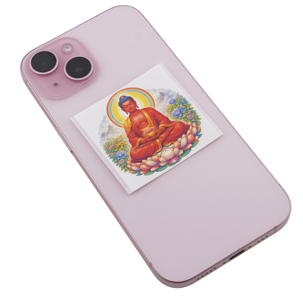 Pe sticker este imprimat Amitabha Buddha asezat pe lotus colorat, cu aura luminoasa in jurul capului, tinand un bol sacru, inconjurat de flori si un fundal armonios ce simbolizeaza iluminarea si linistea profunda.