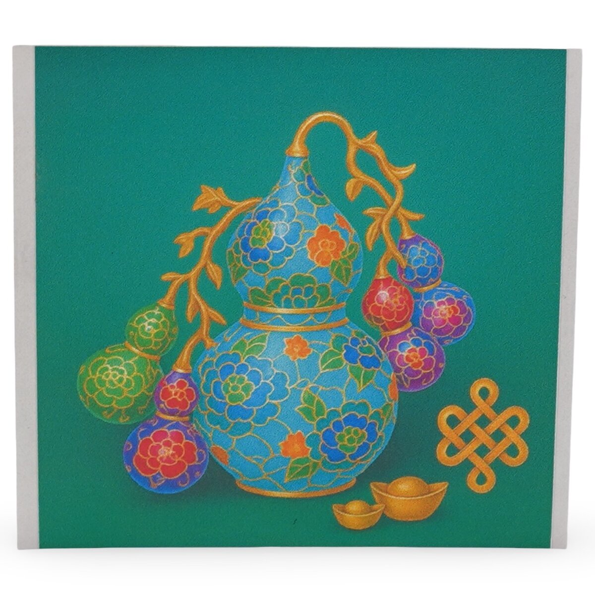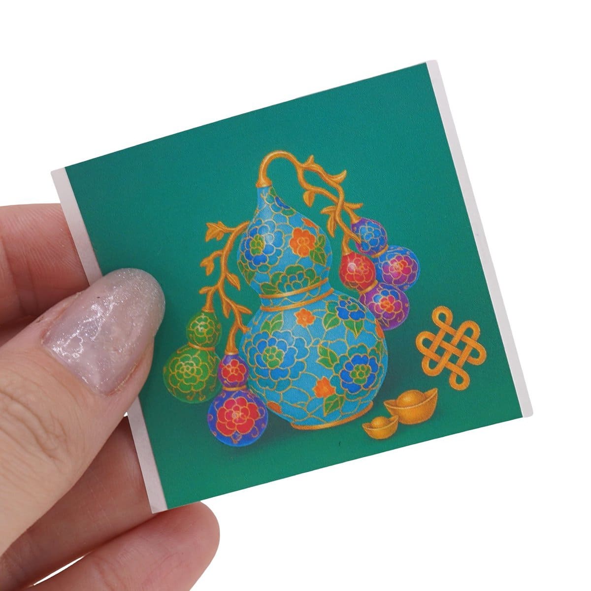 Pe suprafața stickerului se regăsește un Wu Lou mare decorat cu motive florale, alături de nodul mistic și de lingouri aurii, simboluri cunoscute pentru protecția lor subtilă și pentru energia de prosperitate și longevitate pe care o evocă. Forma pătrată îți oferă un aspect ordonat și ușor de integrat în orice spațiu personal, fie că îl lipești pe telefon, pe laptop sau pe o altă suprafață netedă din jurul tău.