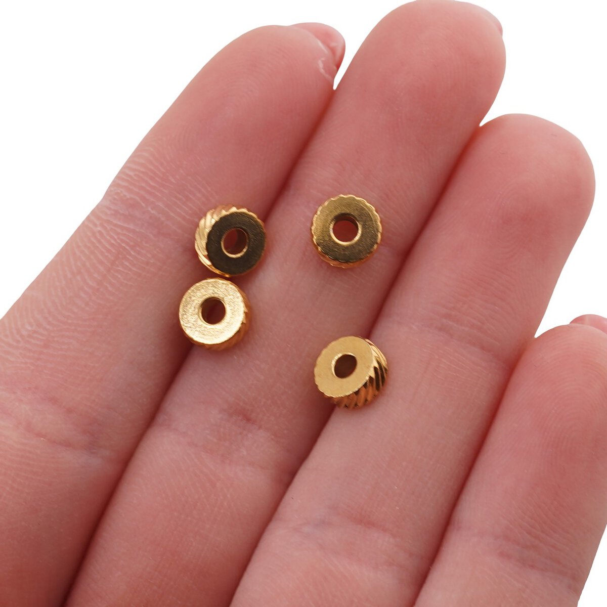 Aceste accesorii din inox auriu, sub formă de discuri distanțieri gravați, sunt o alegere practică și estetică pentru realizarea bijuteriilor handmade. Cu un diametru de 6 mm, bumbii se folosesc între mărgele pentru a crea spațiere, pentru a pune mai bine în valoare designul și pentru a oferi piesei un aspect mai ordonat și mai atent finisat.