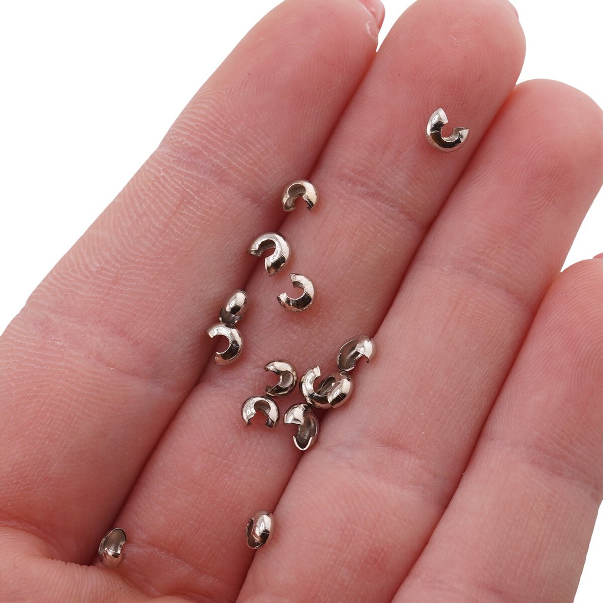 Aceste capace pentru ascunderea crimpilor sunt accesorii utile pentru confectionarea bijuteriilor, potrivite atunci cand vrei ca finisajul unei bratari, coliere sau al altor creatii pe lanturi si snururi sa arate mai curat si mai elegant. Realizate din metal rodiat, in nuanta argintie, ele se folosesc pentru a acoperi crimpurile dupa fixare, transformand zona de prindere intr-un detaliu discret care imita o margea rotunda.