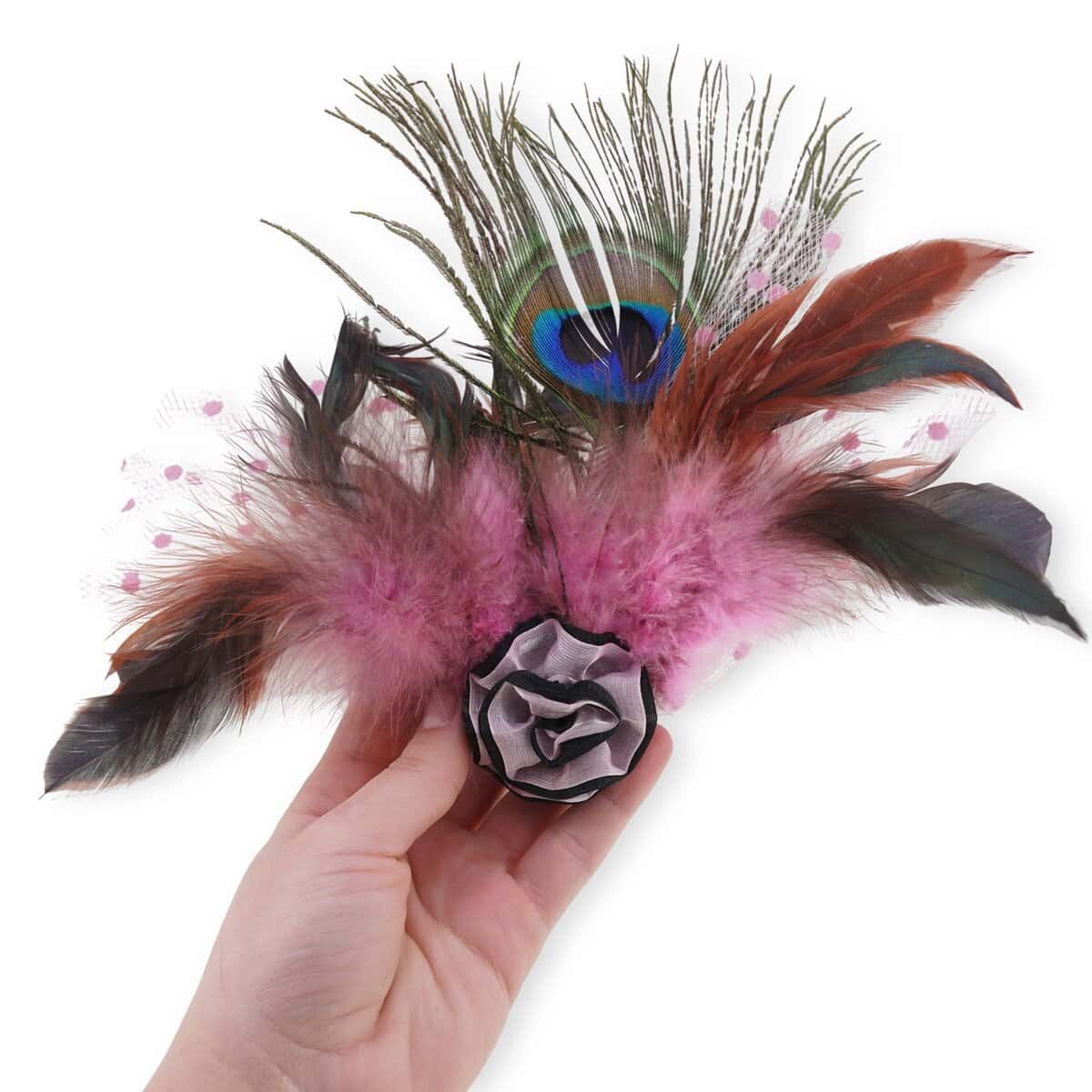 Versatilitatea este punctul lui forte: îl poți fixa ca agrafă pentru a contura coafuri lejere sau îl poți folosi ca broșă pentru rochii, paltoane și cardigane. Paleta multicoloră adaugă dinamism și luminează ținutele neutre, iar penele naturale oferă o expresie delicată, cu volum potrivit. Baza textilă contribuie la confort și protejează țesăturile pe care îl atașezi.