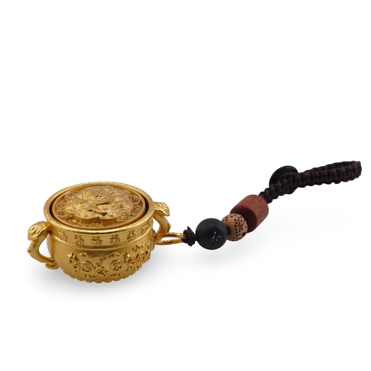 - Amuleta breloc din metal cu Vasul Bogăției și Calul auriu simbolizează prosperitate, avans și noroc financiar