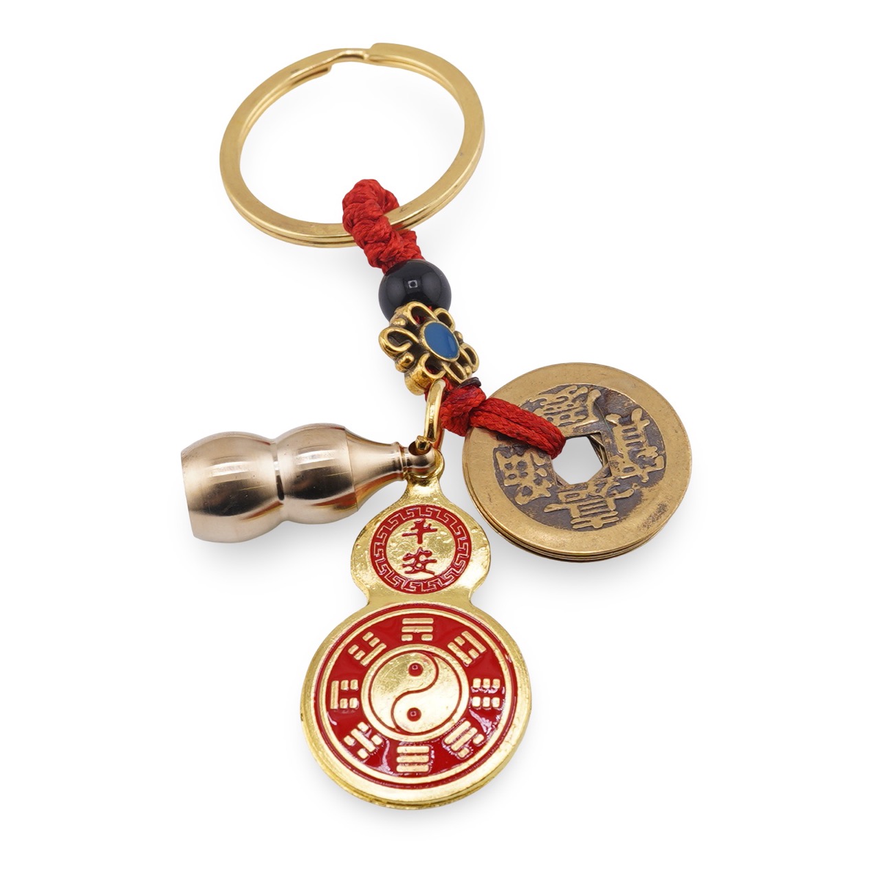 - Amuleta breloc din metal cu Wu Lou, Yin Yang și monede simbolizează sănătate, echilibru și protecție financiară pentru anul
