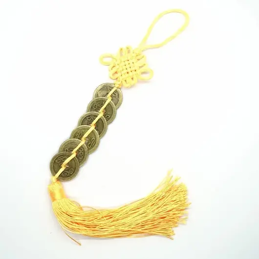 Amuleta Canaf Feng Shui cu 6 monede chinezești și nod mistic, de culoare galbenă, este un obiect spiritual ce aduce armonie și prosperitate în casa ta. Această amuletă este asociată cu zodiile chinezești care corespund energiilor pozitive și norocoase.
