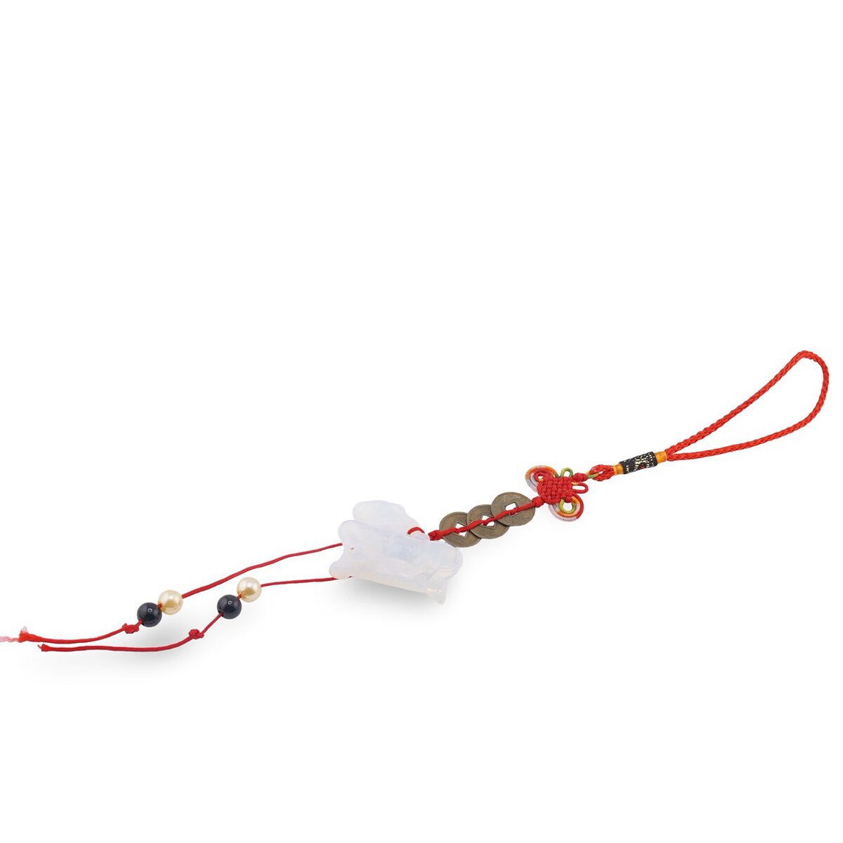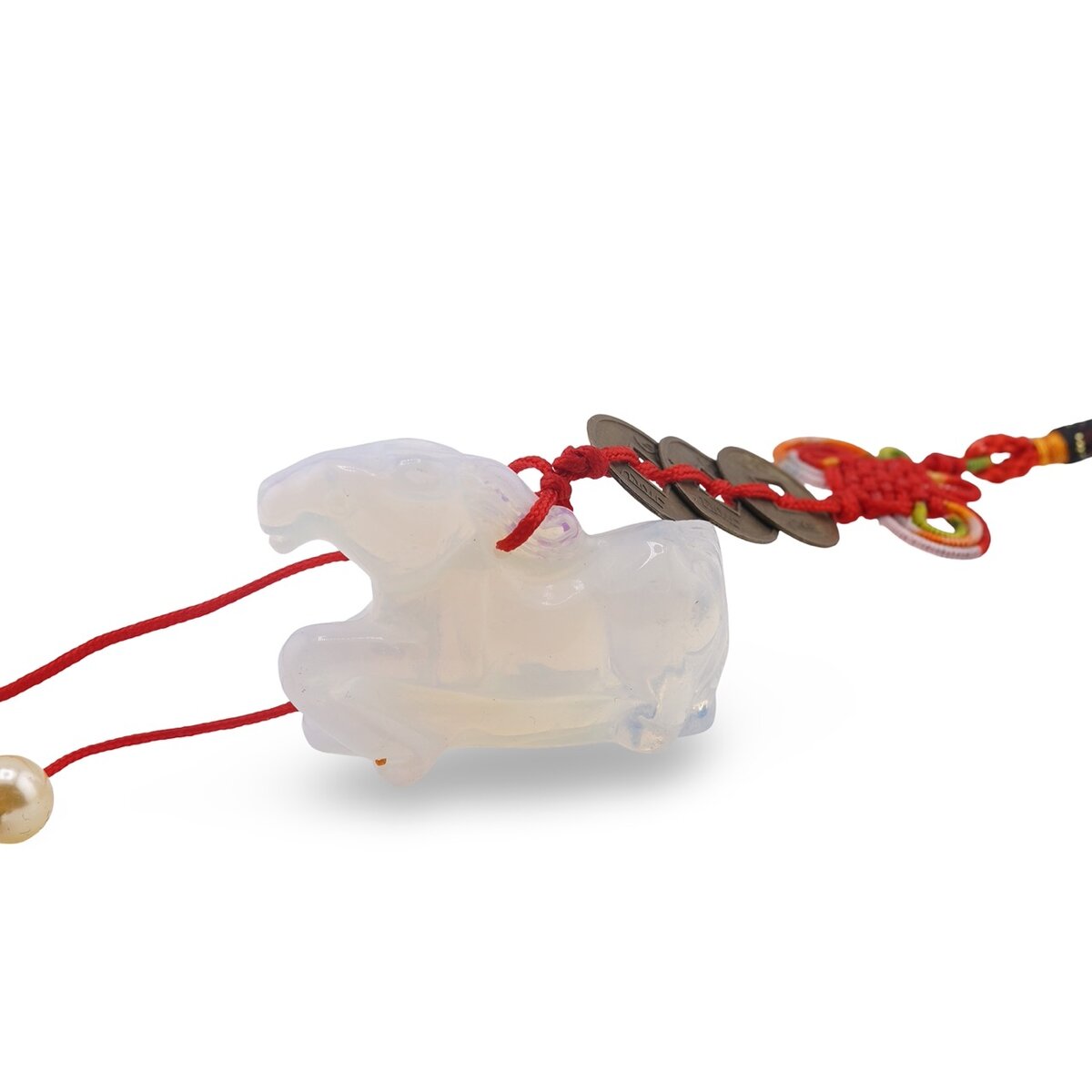 Creată pentru ritmul intens al anului 2026, această amuletă îmbină imaginea Calului din opalit cu un nod mistic și monede decorative, într-o combinație vizuală plăcută de alb și roșu. Calul sugerează mișcare și perseverență, iar opalitul, un cristal artificial cu luciu lăptos, reflectă discret lumina și aduce un aer calm în spațiul tău.