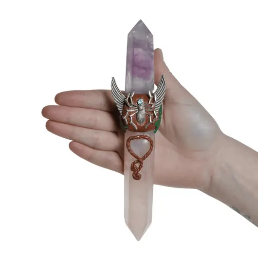 Creată pentru practici de meditație, lucru cu intenția și armonizare energetică, această baghetă din cristal natural 100% îmbină delicatețea cuartului roz cu claritatea și culoarea vie a fluoritului. Detaliul decorativ cu păianjen aduce o notă simbolică inspirată din răbdare și creativitate, transformând piesa într-un instrument plăcut atât pentru spațiul personal, cât și pentru cabinet sau birou.