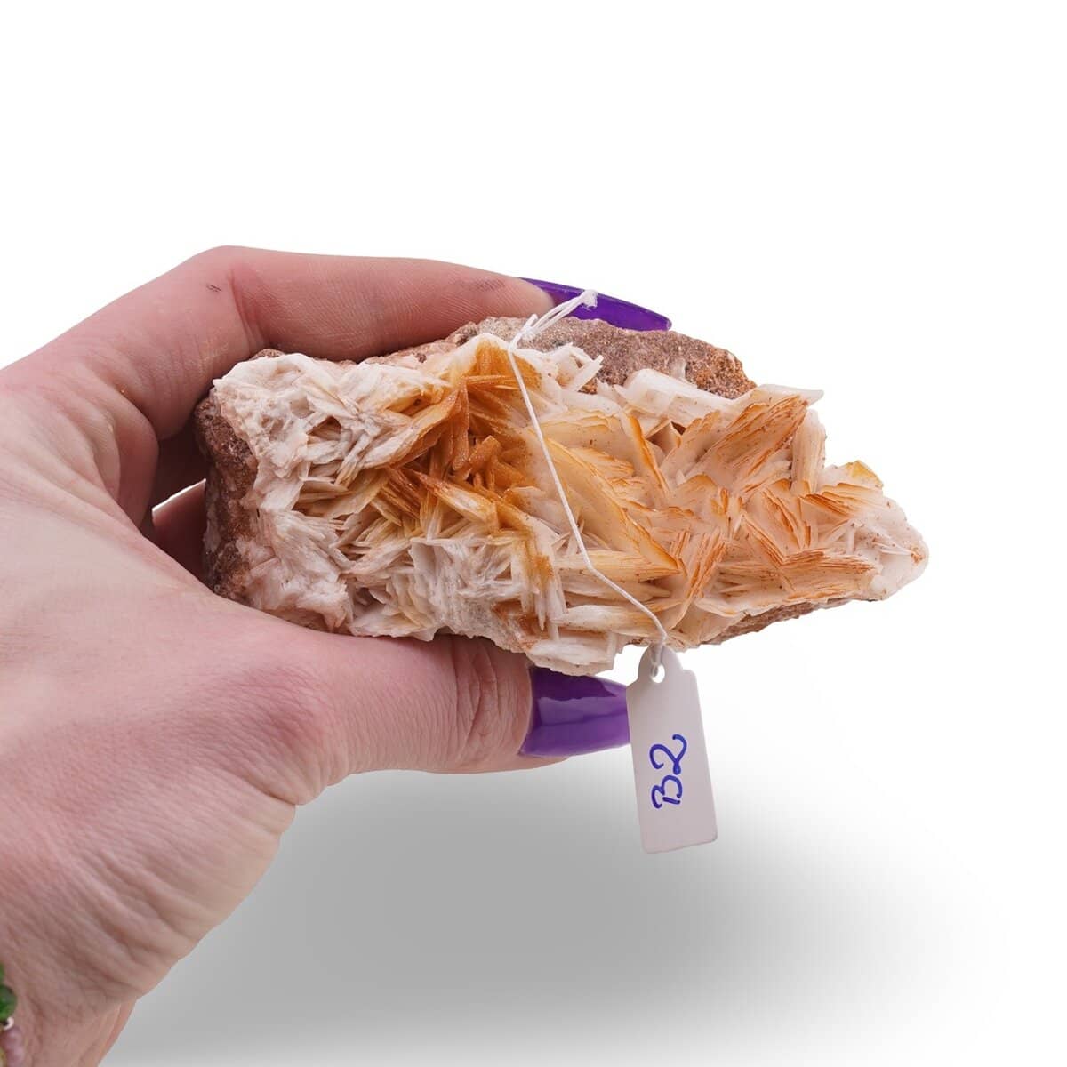 Barita cu vanadinit cristal unicat, B2 îmbină eleganța naturală a baritei albe cu forța caldă a microcristalelor de vanadinit portocaliu. Este un cristal natural, în stare brută, care păstrează farmecul pietrei neprelucrate și originalitatea formelor create în mod natural. Textura baritei este acoperită de mici cristale de vanadinit, cunoscută și ca „piatra motivației” sau vanadat de plumb, oferind un joc interesant de culori și reflexii.