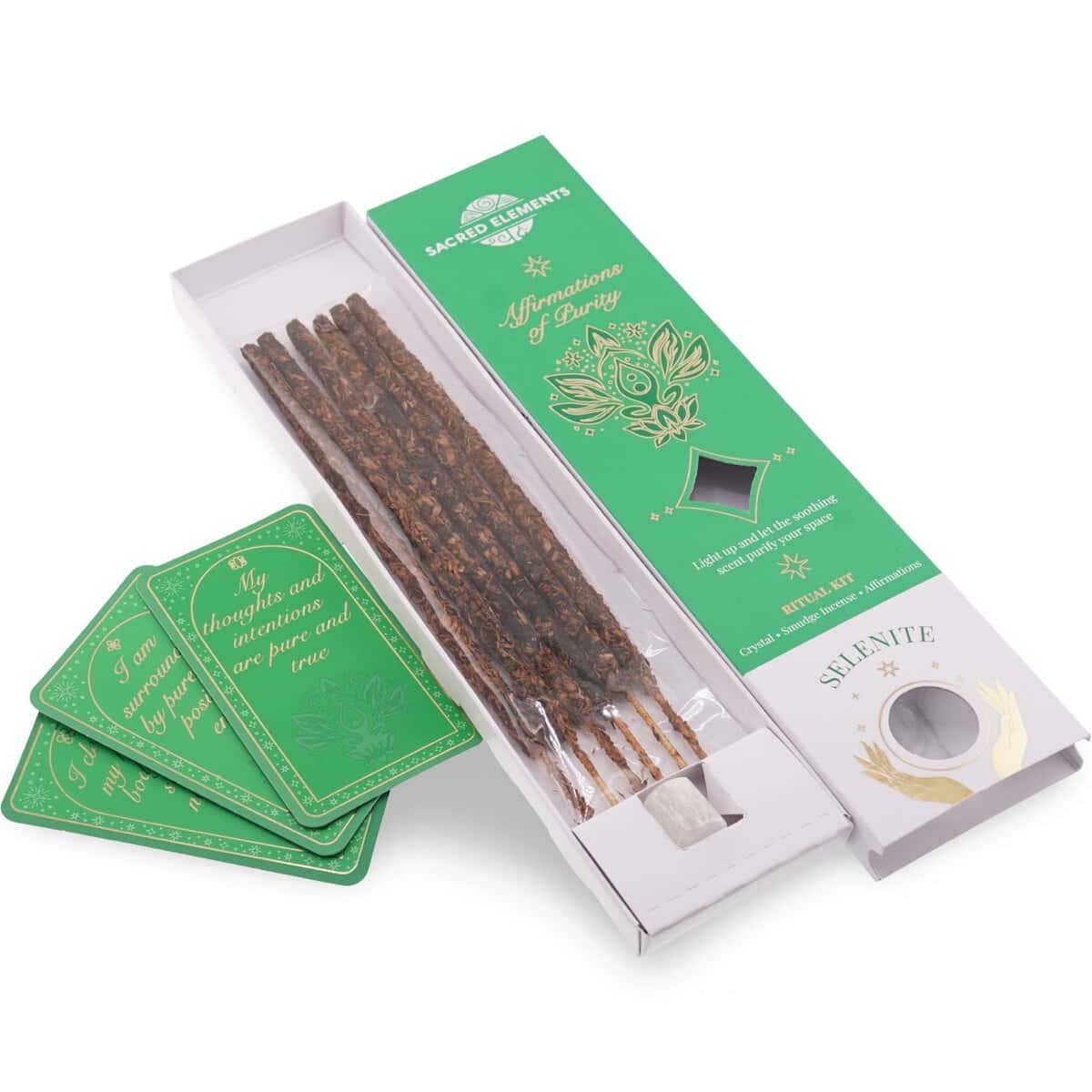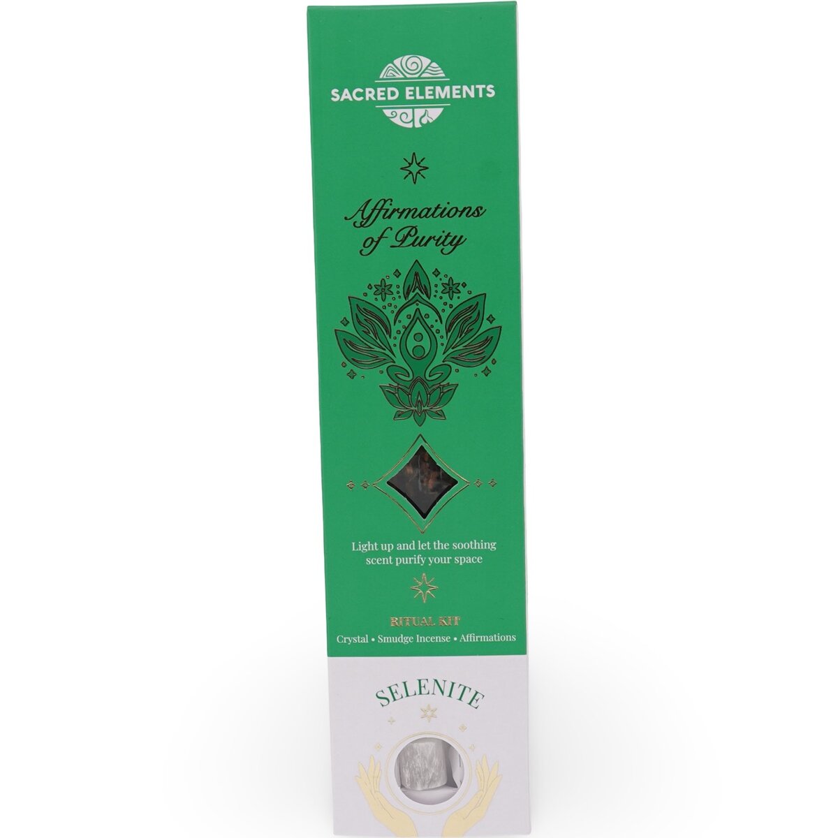 Betisoare parfumate Sacred Elements, Affirmations of Purity - Ritual kit cu Selenit, 20g