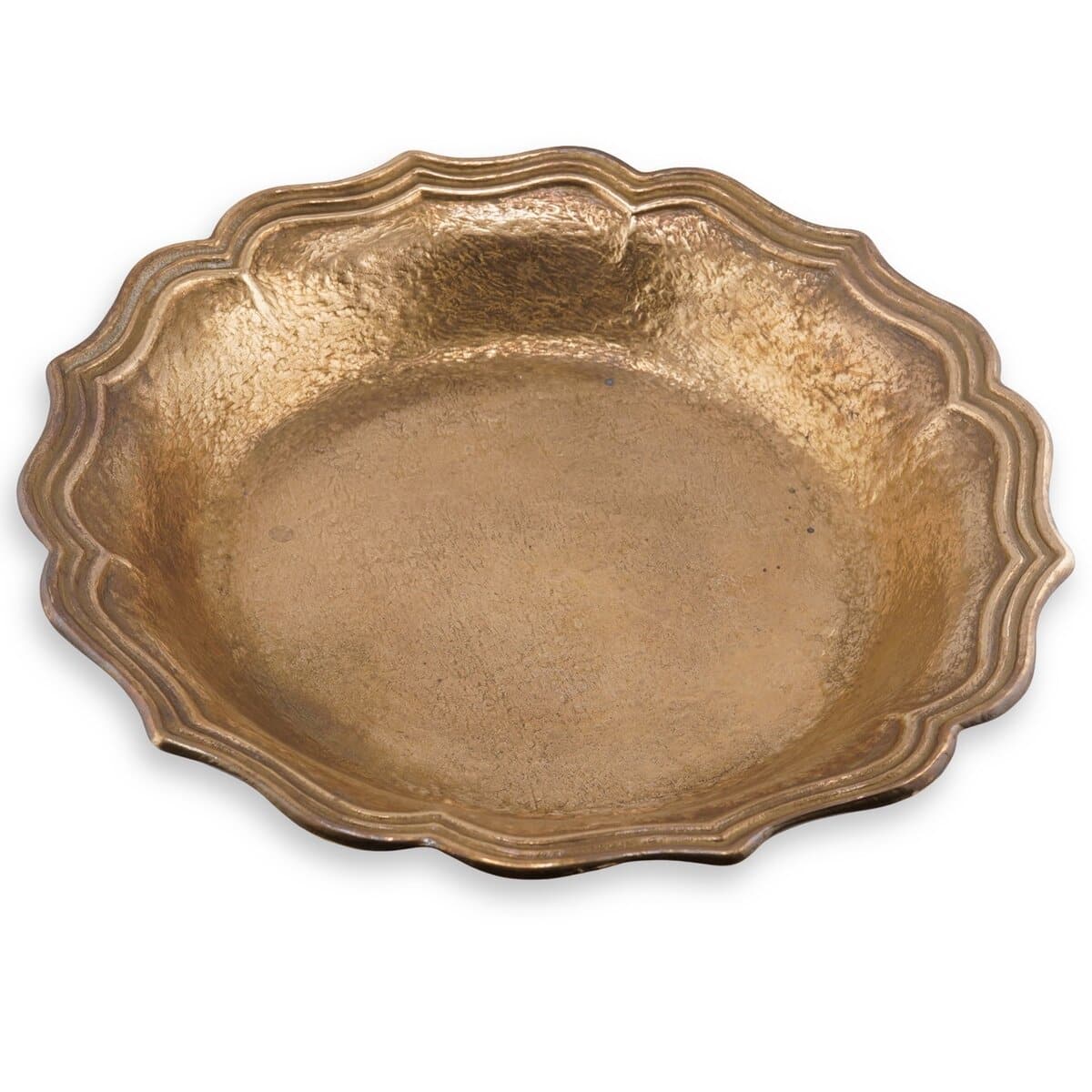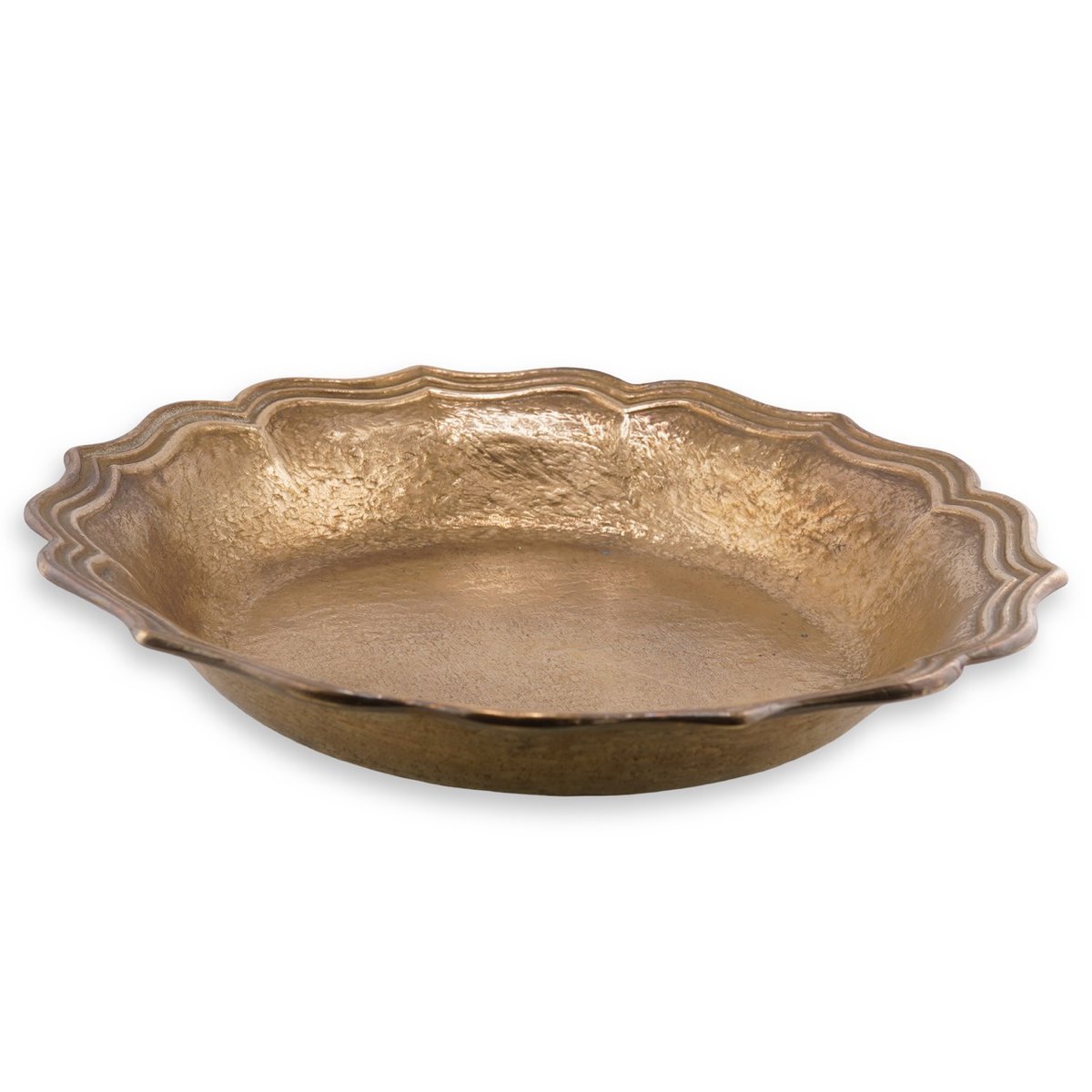 Textura naturală a alamei conferă fiecărei piese o personalitate aparte, iar nuanțele sale aurii se schimbă ușor în funcție de lumină, adăugând profunzime și căldură ambientului. Marginea dublă ornamentală nu este doar un detaliu estetic, ci și un element care accentuează finețea formelor, transformând bolul într-un punct de atracție subtil pe orice masă, comodă sau raft. Poate fi folosit ca piesă decorativă de sine stătătoare sau ca suport pentru obiecte mici, flori uscate ori lumânări, oferind un aer sofisticat și echilibrat încăperii.