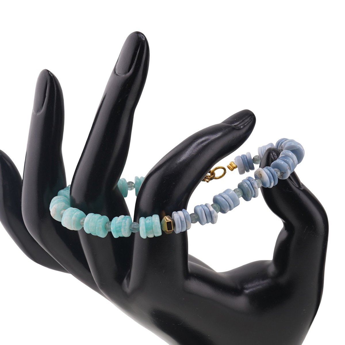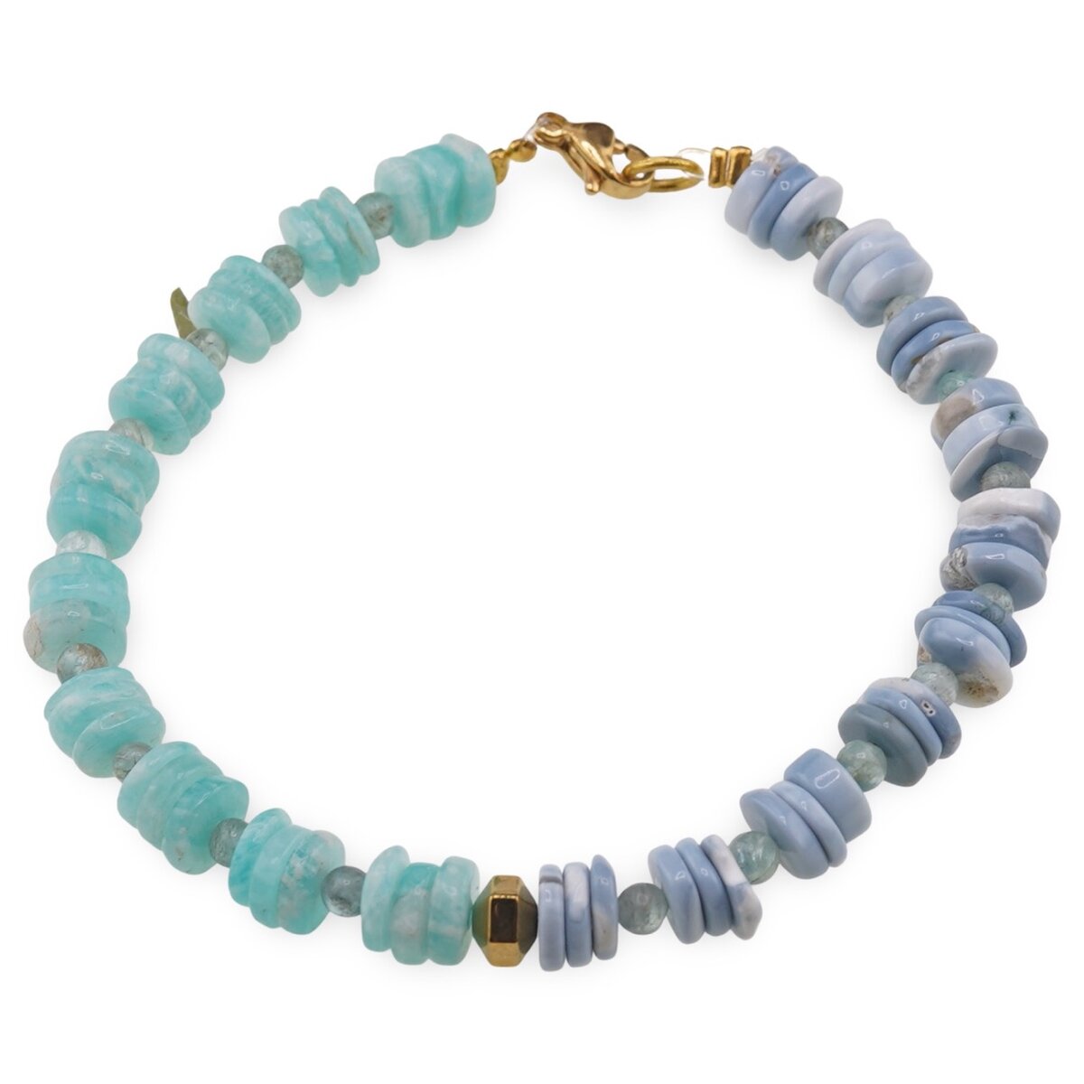 Bratara din amazonit, opal albastru, acvamarin si hematit auriu este o alegere potrivita pentru tine daca ai nevoie de mai multa liniste interioara, claritate si stabilitate in viata de zi cu zi. Combinatia de cristale naturale, slefuite sub forma de rondele de 6-7 mm si sfere fine de 4 mm, aduce impreuna energia apei, a pamantului si a focului intr-un accesoriu usor de purtat, cu o nuanta placuta de albastru, accentuata discret de stralucirea metalica a inoxului auriu.