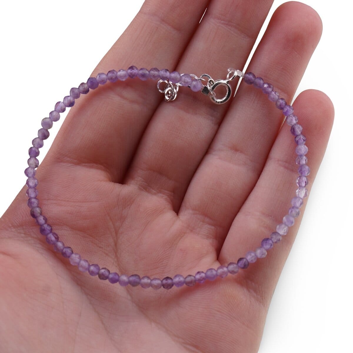 Realizată din cristal natural rezistent, cu duritate 7 pe scara Mohs, brățara este gândită pentru purtare zilnică. Elementele metalice pot fi din metal comun sau argint 925, completând discret luciul violet al pietrelor. Arată bine singură sau alături de alte brățări fine din pietre semiprețioase, pentru un look armonios și personal.