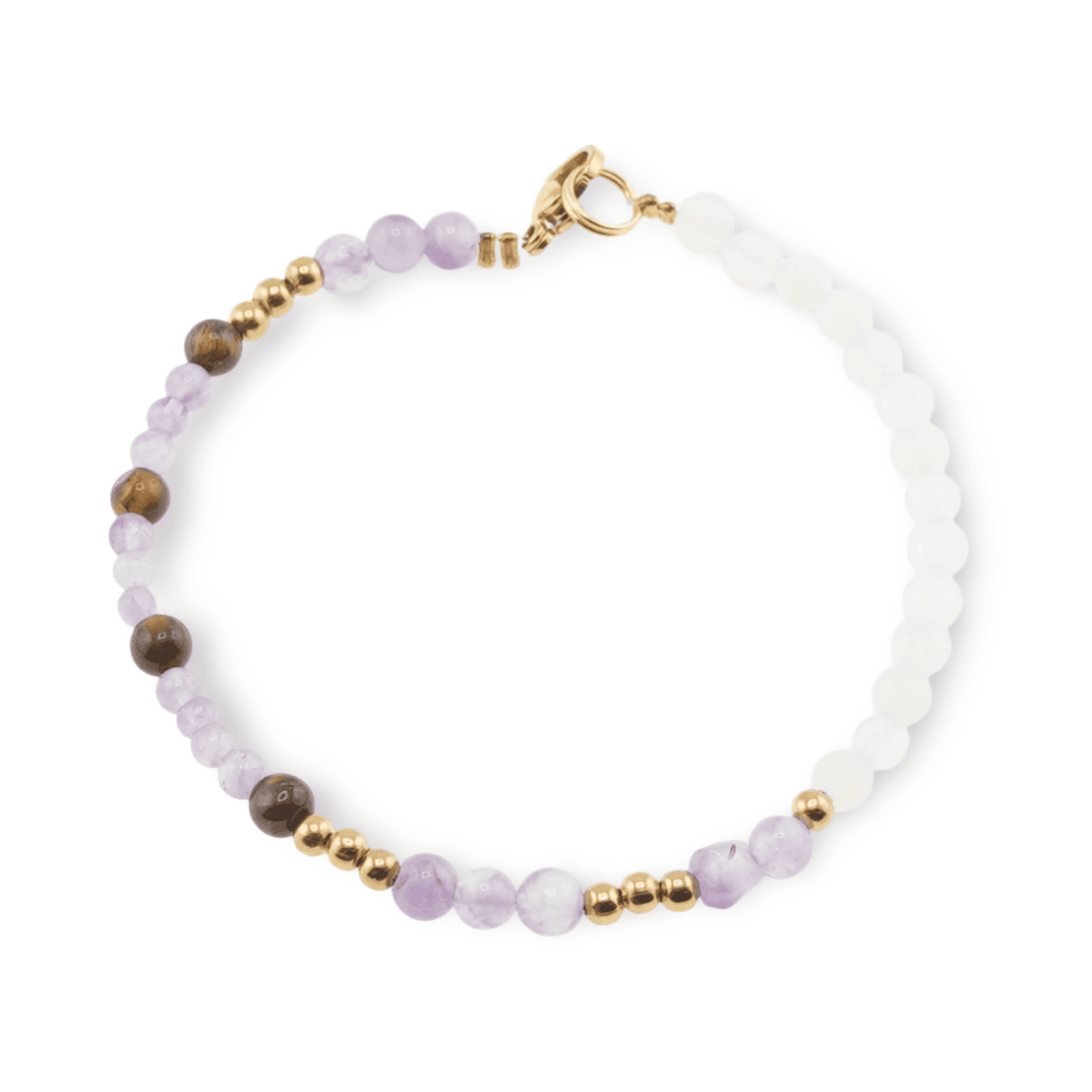 O brățară fină și versatilă, creată din Ametist, Ochi de tigru și Opalit, cu sfere delicate de 3–4 mm și accente calde din bumbi aurii. Combinația de mov, maro și alb opalescent o face ușor de purtat zi de zi, fie că îți dorești mai multă calmare interioară, claritate mentală, curaj sau creativitate.