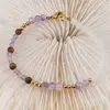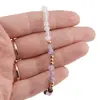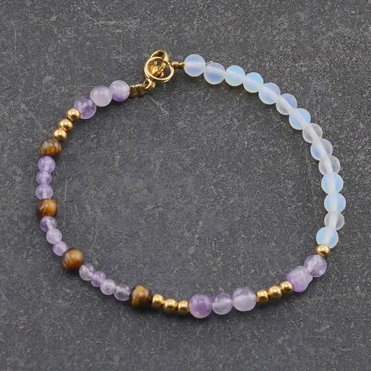 Ametistul, cunoscut și ca cuart violet, este apreciat pentru starea de liniște și focus, în timp ce Ochiul de tigru, asociat adesea cu „piatra curajului”, aduce încredere și energie stabilă. Opalitul, o sticlă opalescentă cu reflexe discrete, completează armonios ansamblul. Mixul îmbină cristale naturale (ametist, ochi de tigru) cu elemente sintetice (opalit), oferind un echilibru între eleganță și rezistență la purtare cotidiană; în funcție de piatră, duritatea este aprox. 5–7 pe scara Mohs. Textura fină a sferelor de 3–4 mm se așază confortabil pe încheietură, iar bumbi aurii adaugă un accent discret, potrivit pentru asortare cu alte brățări.