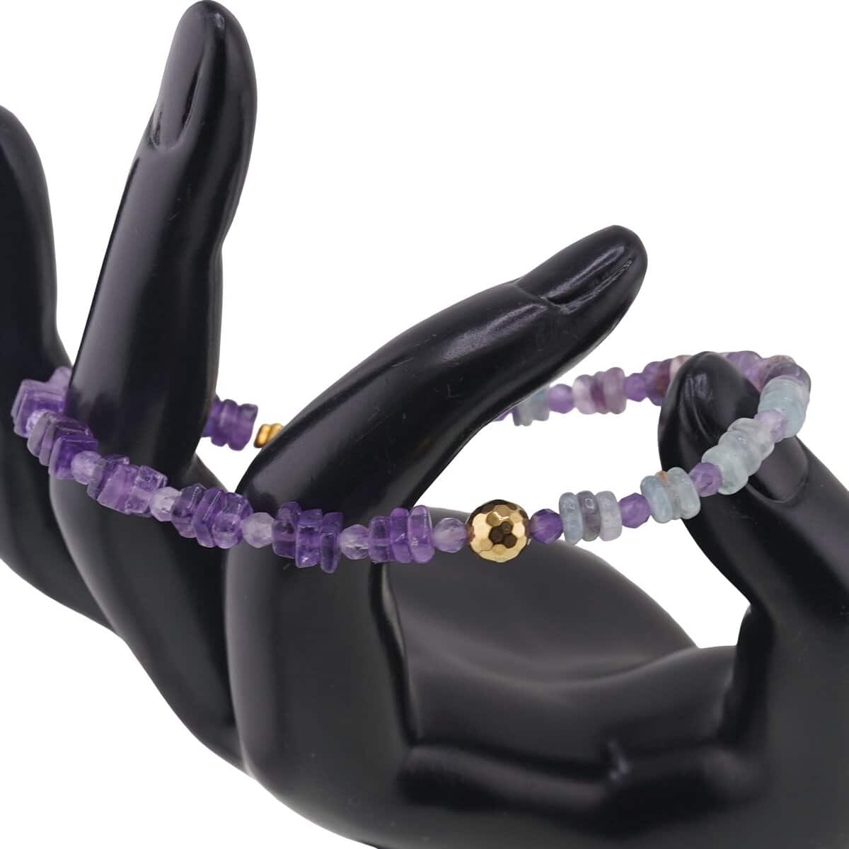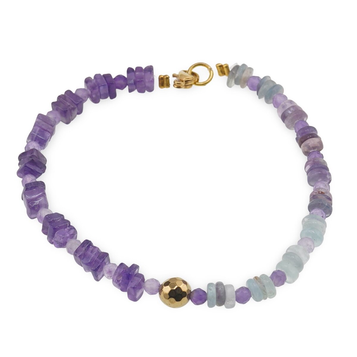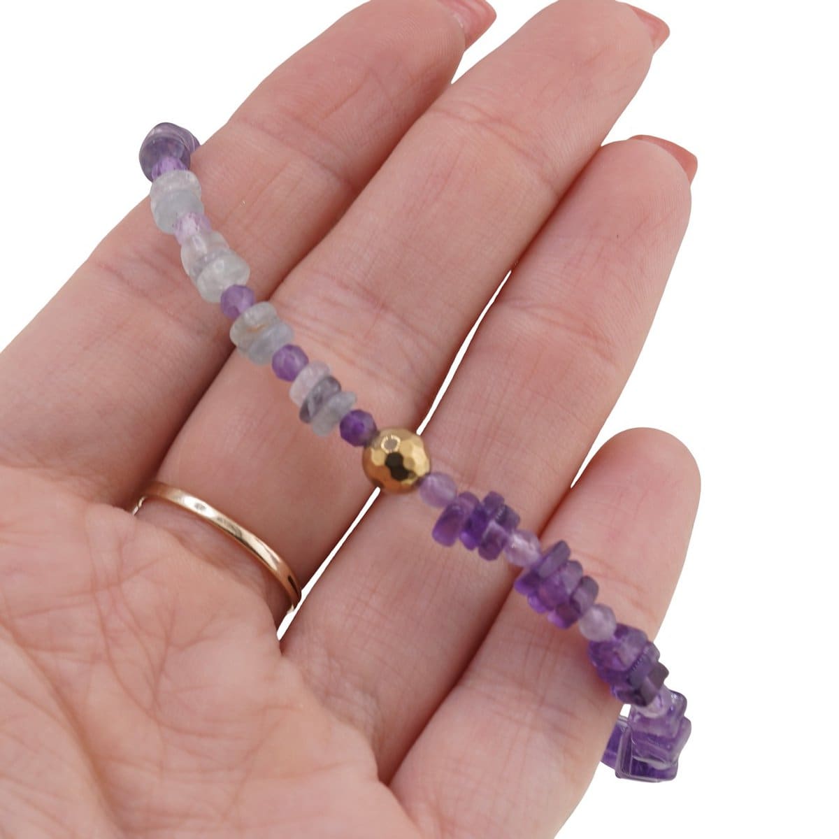 Această brățară delicată îmbină armonios cristale naturale de ametist, fluorit și hematit, într-un joc de forme și culori care atrage privirea și susține starea de bine. Nuanțele de mov, verde și auriu se completează firesc, oferindu-ți un accesoriu pe care îl poți purta atât zi de zi, cât și în momentele în care ai nevoie de mai multă liniște interioară și claritate mentală.