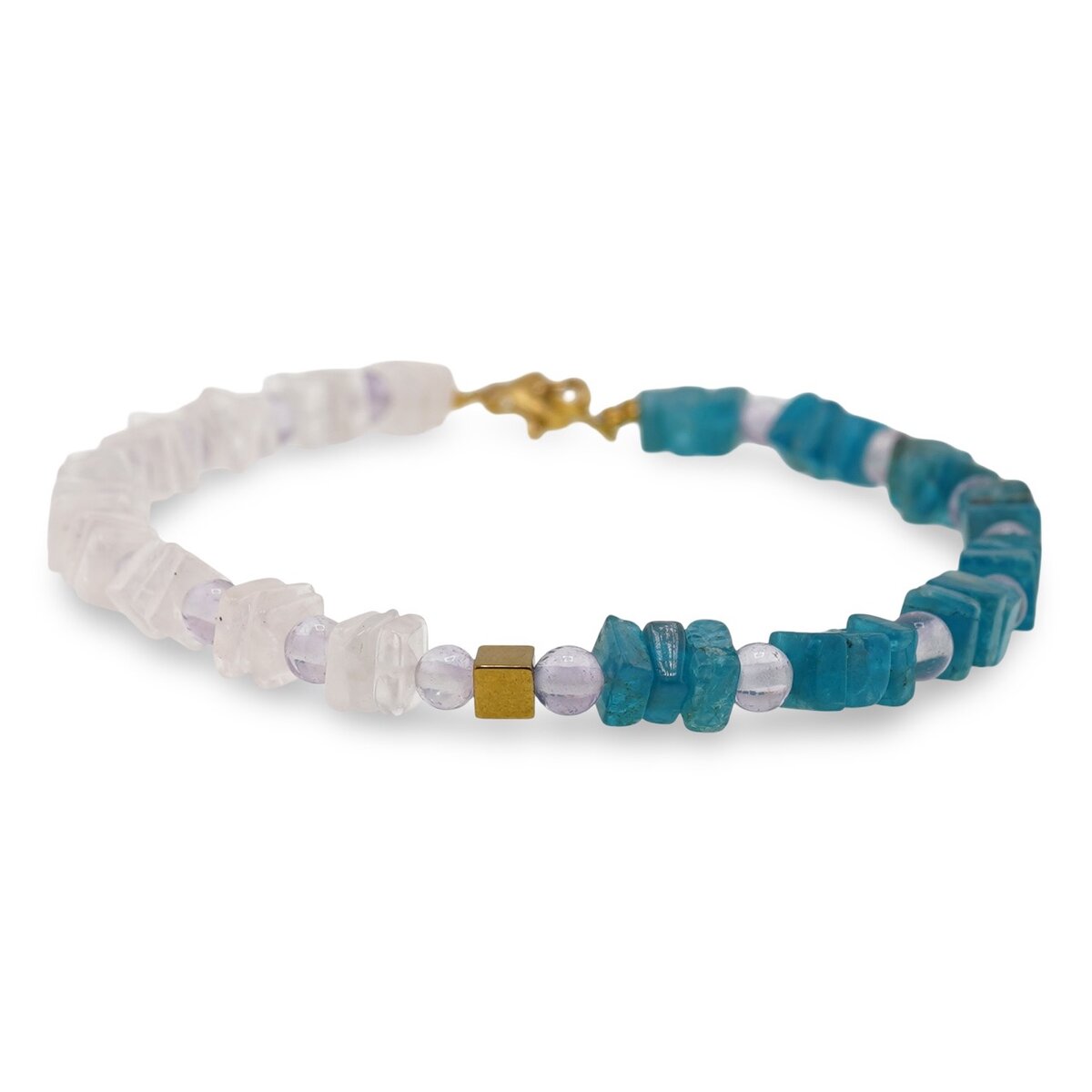 O combinație echilibrată de culori și intenții, această brățară reunește apatit, cuart roz, ametist și hematit auriu pentru un accesoriu ușor de purtat zi de zi. Pătrățelele fine de cuart roz de 5 mm se îmbină armonios cu sferele delicate de ametist de 4 mm și cu micile cuburi de hematit auriu de 4 mm, completate de accente de apatit. Cristalele sunt naturale (100%), iar elementele cu efect auriu sunt tratate pentru a aduce un plus de strălucire. Ametistul – cunoscut și ca Amethyst sau cuart violet – are duritate aprox. 7 pe scara Mohs, apatitului (Apatite, fosfat de calciu) îi corespunde aprox. 5, iar hematitului (Hematite, oxid de fier) 5.5–6.5, ceea ce conferă brățării rezistență pentru purtare curentă.