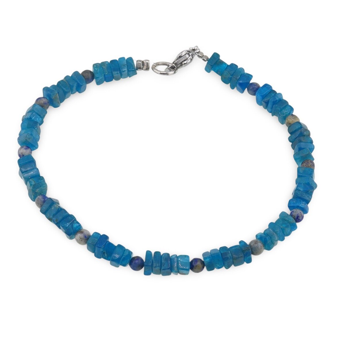 Albastrul profund al Lapis Lazuli se întâlnește cu tonurile vii ale Apatitului într-o brățară din cristale naturale 100%, gândită pentru echilibru și claritate. Designul combină discret pătrățele fine de aproximativ 4 mm cu sfere delicate de circa 3 mm, creând un ritm vizual plăcut și o senzație ușoară la purtare, potrivită pentru fiecare zi.