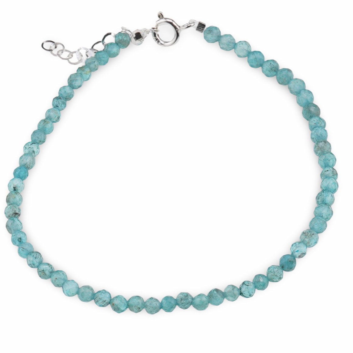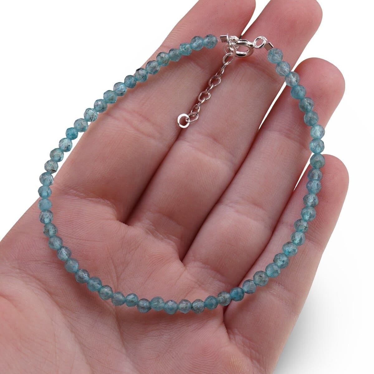 Descoperă o brățară discretă și expresivă, creată pentru tine din Apatit natural 100%, cunoscut și ca apatite sau fosfat de calciu. Nuanțele de albastru limpede ale cristalelor îți aduc o senzație de prospețime, iar strălucirea fină a sferelor fațetate pune în valoare eleganța unei piese pe care o poți purta zi de zi.