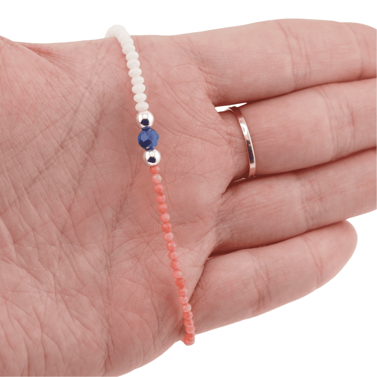 Bratara Coral roz sfere fatetate, Coral alb discuri, Kianit sfera fatetata si Hematit argintiu, 2-5mm.