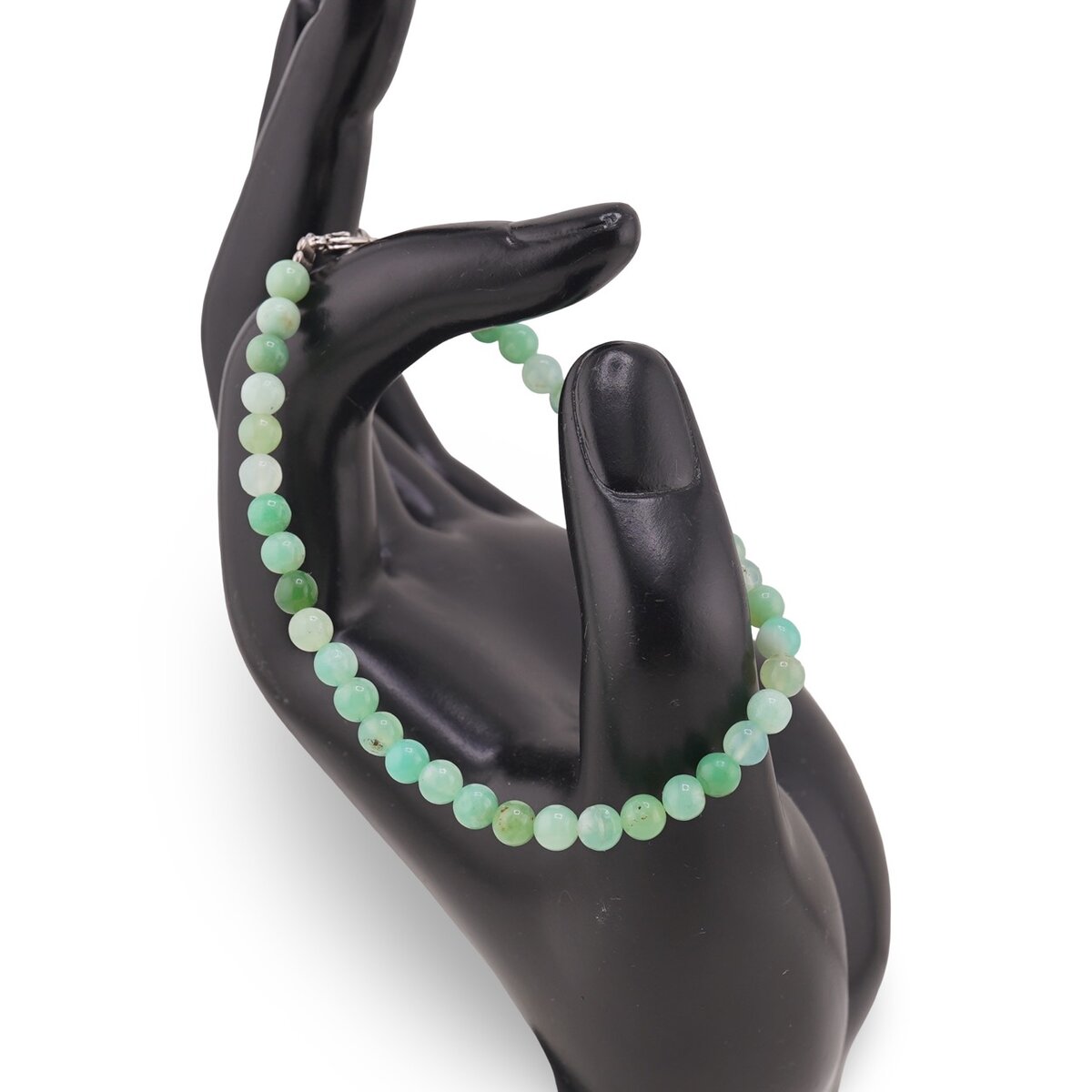Bratara din Crisopraz cu sfere de 4 mm este o alegere potrivită pentru tine dacă îți dorești un accesoriu discret, cu o energie calmă și susținătoare. Nuanța de verde, plăcută și liniștitoare, este asociată cu regenerarea și cu redescoperirea speranței, motiv pentru care Crisoprazul mai este numit și „piatra regenerării”.