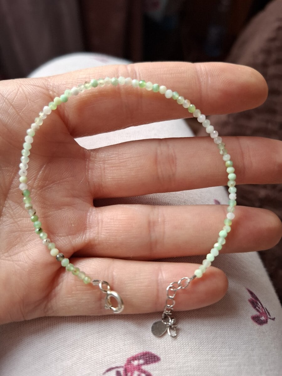 Sferele fațetate de 2 mm prind frumos lumina și oferă o textură elegantă, completată de luciul argintului. Crisoprazul (cunoscut și ca Chrysoprase, cuart microcristalin verde sau piatra regenerării) este apreciat în tradiție pentru modul în care susține echilibrul emoțional, intuiția și claritatea mentală, fiind adesea purtat ca protecție energetică și ca simbol al unor procese de vindecare profundă trăite conștient. Cu o duritate de 6,5–7 pe scara Mohs, se pretează la purtare frecventă, cu îngrijire adecvată.