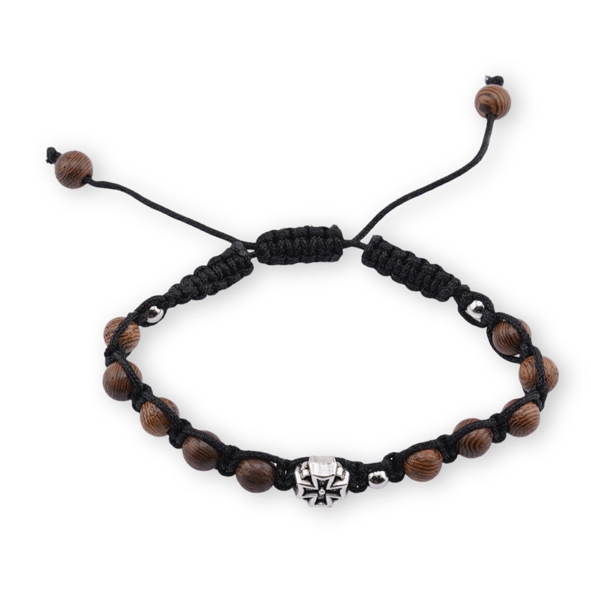 Brățară cu nod culisant, sfere lemn natural și cruce centrală