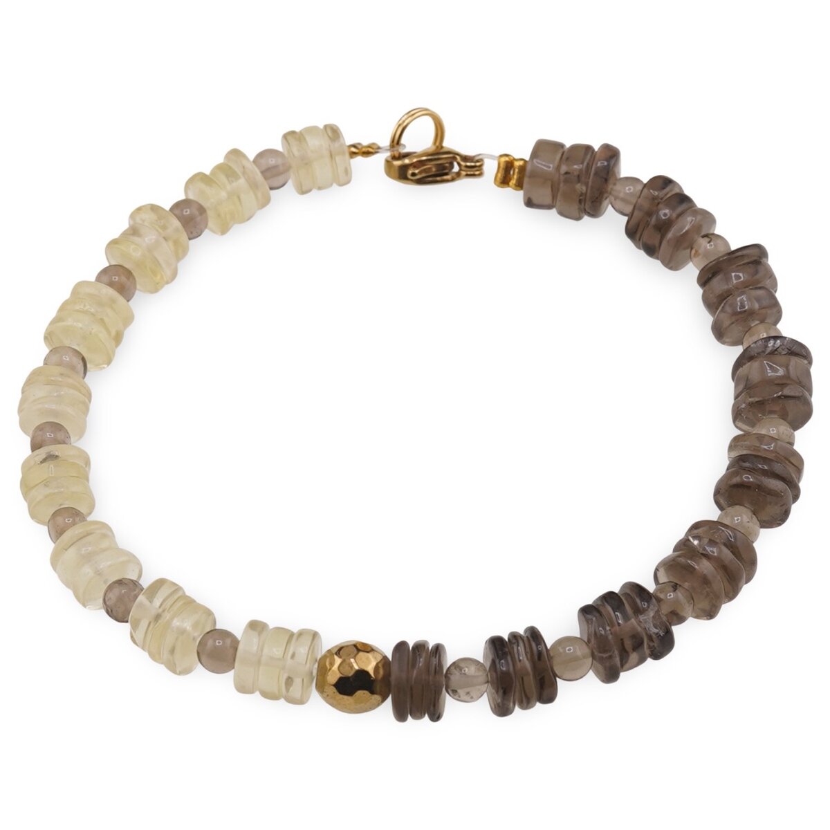 Bratara din cuart fumuriu, citrin si hematit auriu este creată pentru tine dacă îți dorești mai multă claritate, energie și stabilitate în viața de zi cu zi. Cristalele naturale, șlefuite în rondele de 6–7 mm și sfere fine de 4 mm, se îmbină armonios în nuanțe de galben cald și gri fumuriu, susținute de elemente din inox auriu, ușor de asortat la aproape orice ținută.