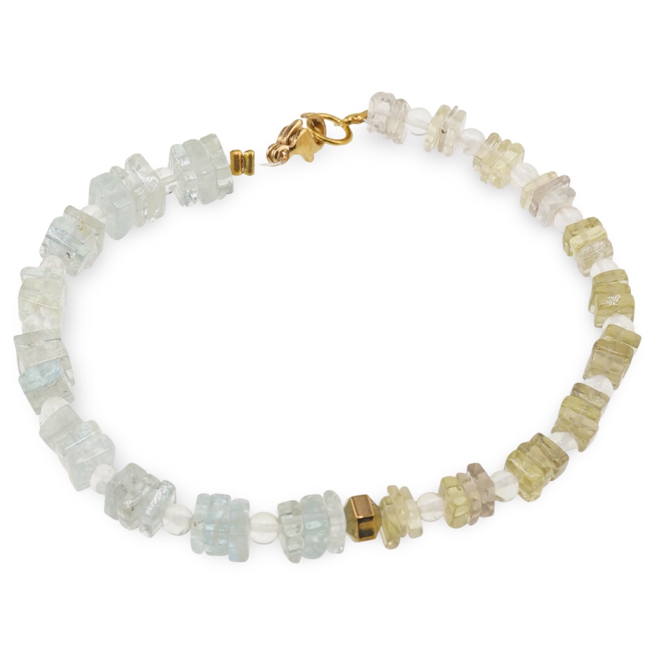 Această brățară combină într-un mod plăcut nuanțele de albastru, galben și transparent, aducând împreună acvamarinul, cuartul lemon, cuartul transparent și hematitul auriu într-un accesoriu discret, ușor de purtat zi de zi. Cristalele naturale și tratate sunt șlefuite în patratele fine de 4-6 mm și sfere delicate de 3 mm, astfel încât brățara să fie comodă și în același timp plină de personalitate.