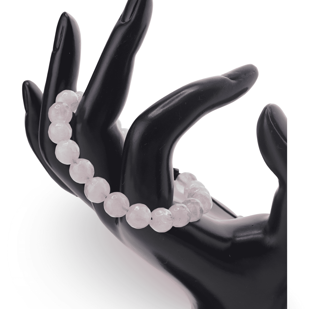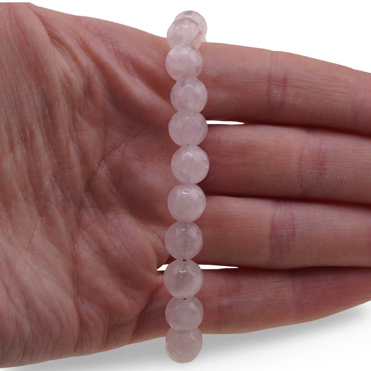Bratara Cuart roz cu sfere fatetate de 8 mm este creată pentru tine dacă îți dorești un accesoriu discret, cu un aer romantic și calm. Nuanta sa roz pal aduce o notă de finețe oricărei ținute, iar strălucirea dată de fațetarea atentă a fiecărei sfere atrage lumina și o pune frumos în valoare pe încheietura mâinii.