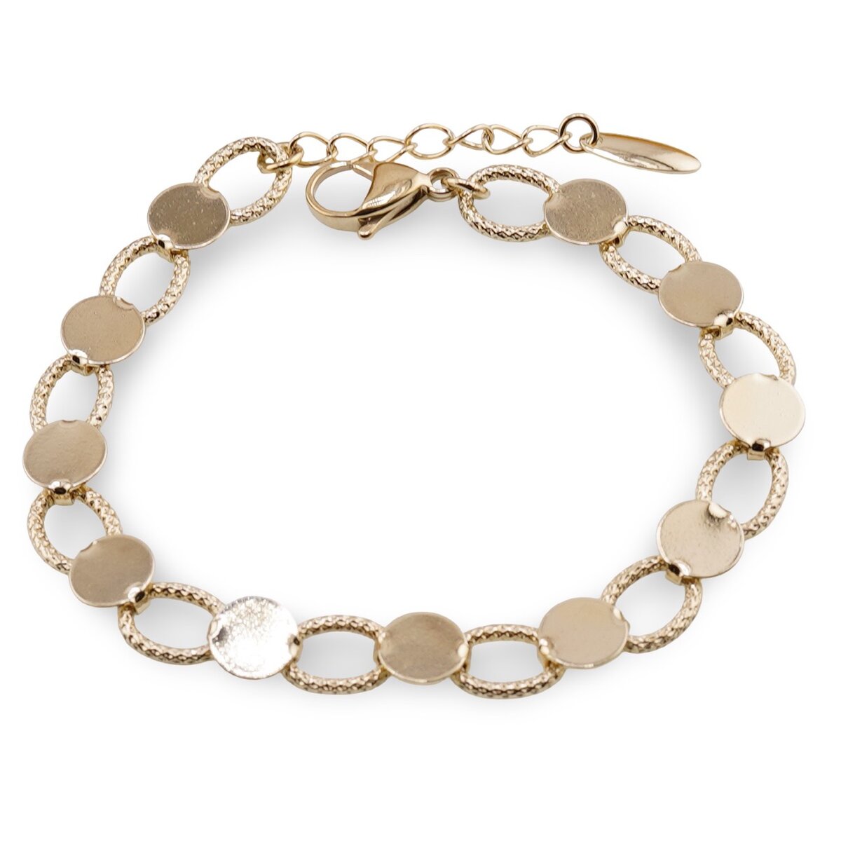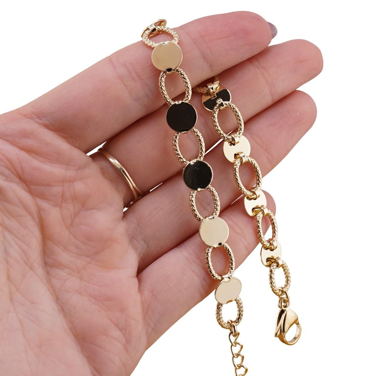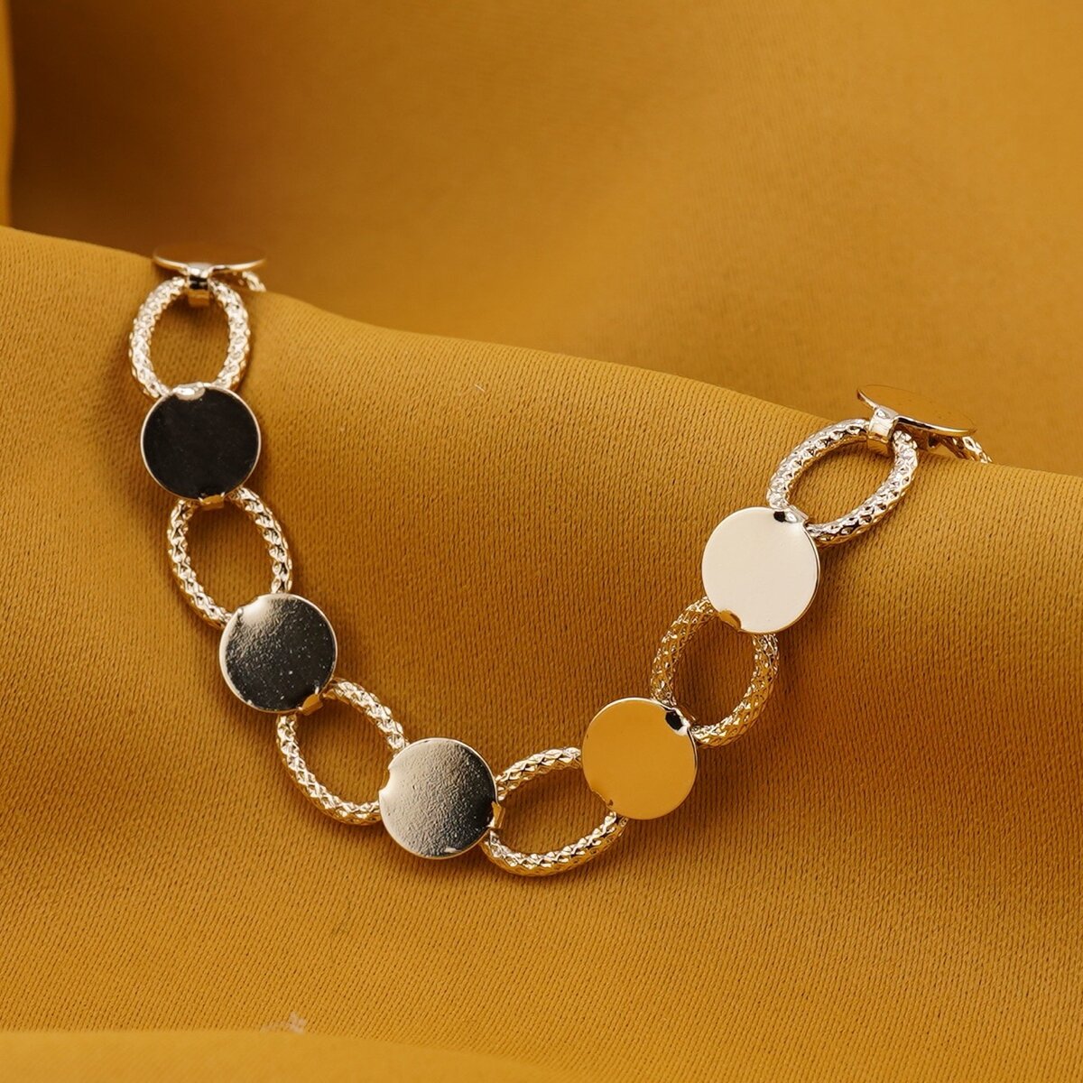 Gândită pentru momentele în care îți dorești un plus de rafinament, această brățară aduce împreună caldul cuprului și strălucirea plăcută a aurului galben 18k. Designul cu zale texturate și cercuri creează un joc discret de lumini și umbre, iar nuanța aurie se integrează firesc atât în ținutele de zi, cât și în cele de seară. Datorită lungimii cuprinse între 20–23 cm, brățara se așază comod pe încheietură și oferă lejeritatea de care ai nevoie în purtarea de zi cu zi.