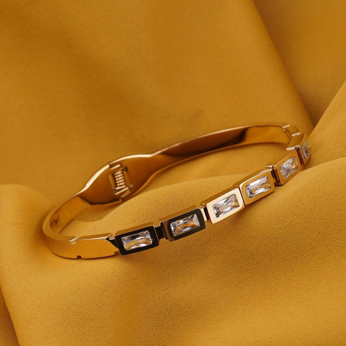 Gândită pentru un stil curat și ușor de purtat, această brățară aduce un accent luminos la încheietura ta. Baza din cupru placat cu aur galben 18k oferă un ton auriu cald și o strălucire plăcută, pe care o poți integra fără efort în ținutele de zi cu zi. Zirconiile tăiate baguette, așezate într-o linie ordonată, captează discret lumina și adaugă un detaliu geometric care nu trece neobservat, dar rămâne rafinat.