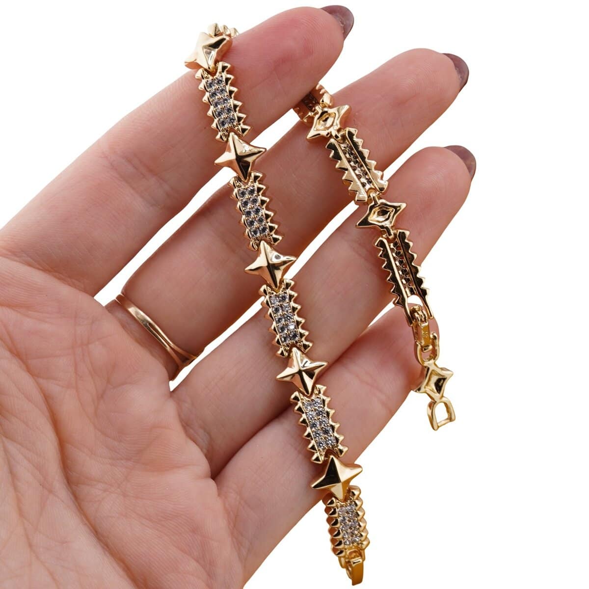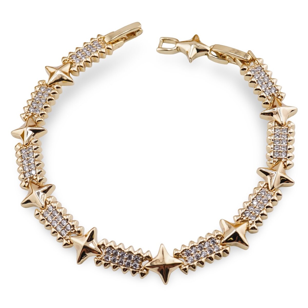 Baza din cupru este acoperită cu un strat de aur galben 18k ce conferă brățării nuanța caldă specifică aurului, cu un luciu subtil. La o lungime de 19 cm, se așază natural pe încheietură și oferă o purtare comodă pe parcursul întregii zile. Zirconiile adăugate în puncte-cheie prind lumina frumos, creând un efect fin de sclipire, în timp ce steluțele aduc acel detaliu care face diferența într-o bijuterie auriu strălucitoare.