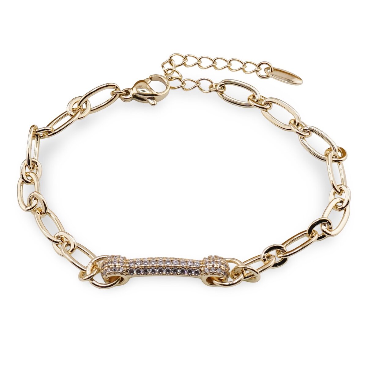 O brățară care îmbină eleganța cu lejeritatea de zi cu zi, această piesă te întâmpină cu un auriu cald și o linie modernă. Zalele mari creează un ritm vizual plăcut, iar micul charm decorat cu zirconii adaugă un luciu fin, discret, care prinde lumina fără să domine. Este genul de accesoriu pe care îl porți ușor și te bucuri de efectul lui imediat.
