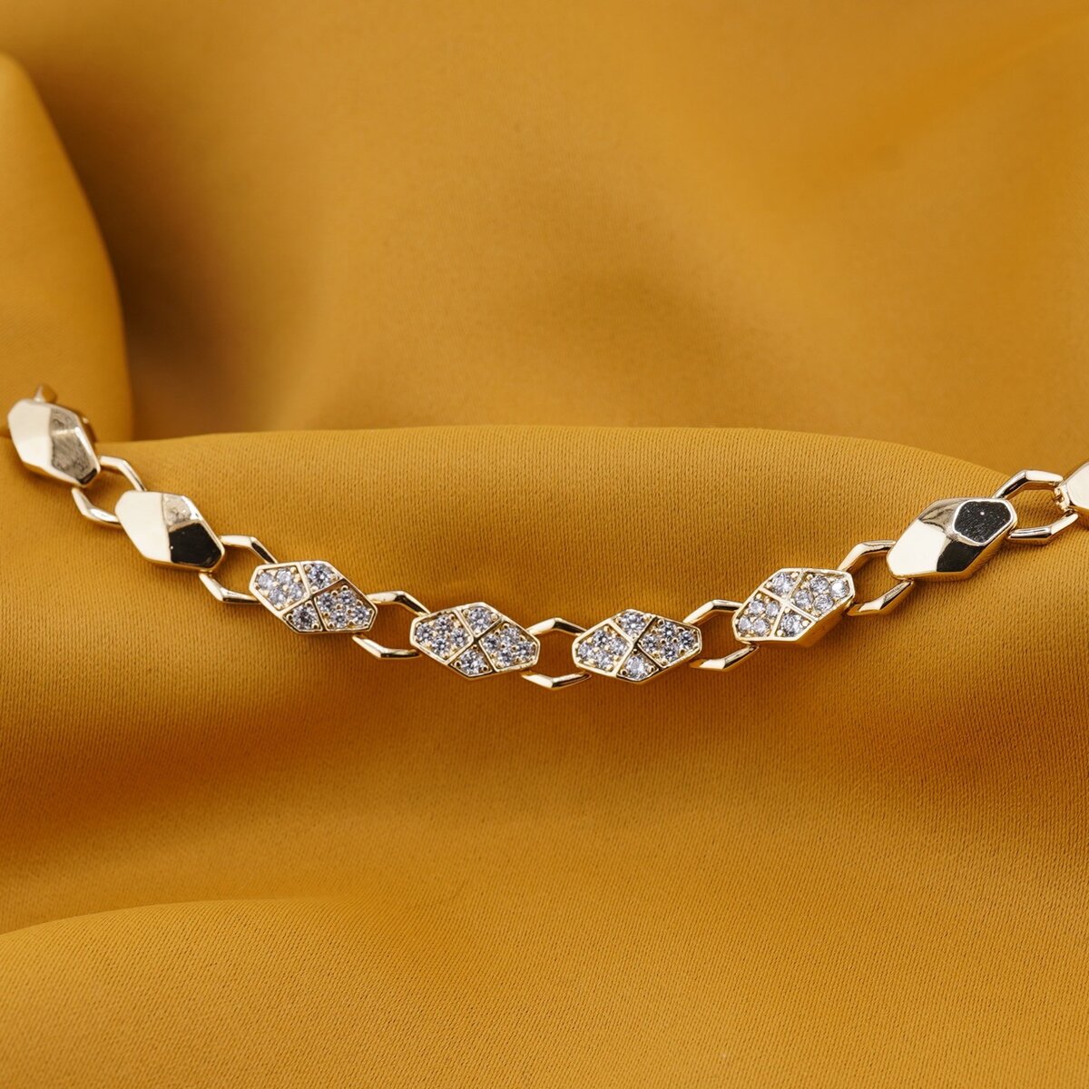 Gândită pentru a aduce o notă de lumină discretă în fiecare zi, această brățară auriu cald pune în valoare un model rombic rafinat, accentuat de zirconii atent așezate. Fie că o porți la birou sau la o ieșire relaxată, strălucirea echilibrată oferă un plus de eleganță fără a încărca ținuta.