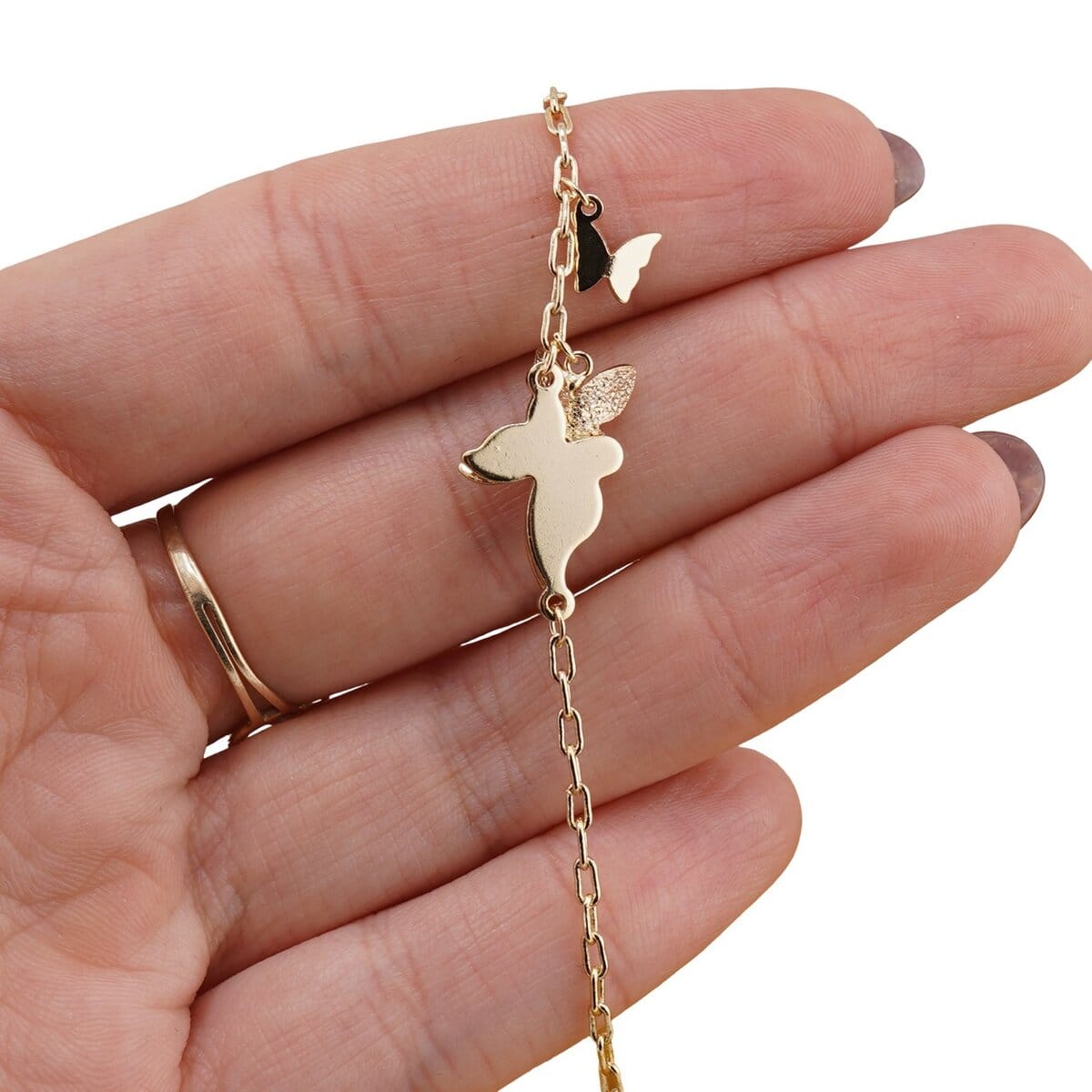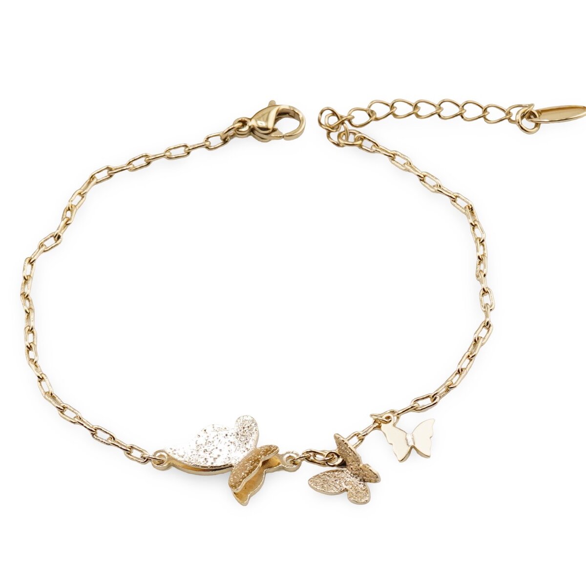 Realizată din cupru placat cu aur galben 18k, această brățară combină aspectul rafinat cu confortul la purtare. Lungimea ajustabilă, cuprinsă între 17 și 21 cm, îți permite să o reglezi simplu, astfel încât să stea bine pe încheietură, fie că o porți singură, fie în combinații cu alte bijuterii. Designul cu zale mici conferă suplețe și lejeritate, în timp ce fluturii delicat conturați aduc un detaliu care atrage privirea fără a încărca.