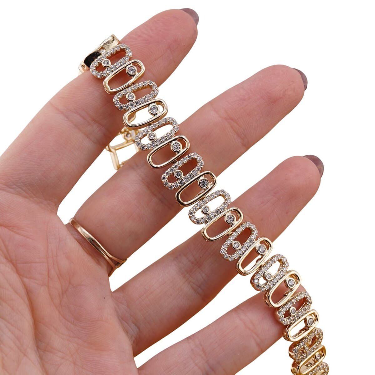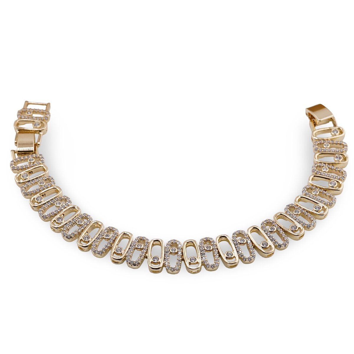Gândită pentru momentele în care îți dorești un accent luminos, această brățară în nuanță aurie îmbină liniile clasice cu detalii moderne. Zalele ovale se așază fluid pe încheietură, iar zirconiile dispuse central surprind discret lumina, adăugând o strălucire fină fără a fi ostentativă.