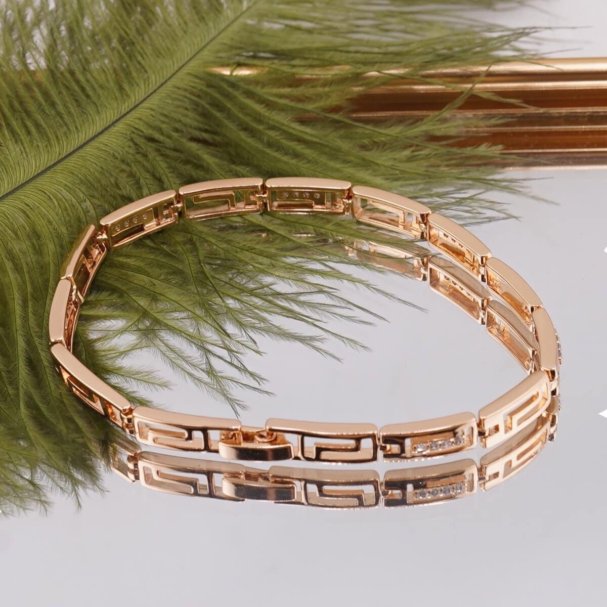 Bratara din cupru placat cu aur rose 14k, cu zale geometrice fine și inserții de zirconii strălucitoare, este un accesoriu creat pentru tine dacă îți dorești eleganță discretă și susținere energetică în același timp. Nuanța caldă de auriu rose pune în valoare încheietura, iar luciul delicat al zirconilor adaugă o notă rafinată, ușor de integrat atât în ținutele de zi, cât și în cele de seară.