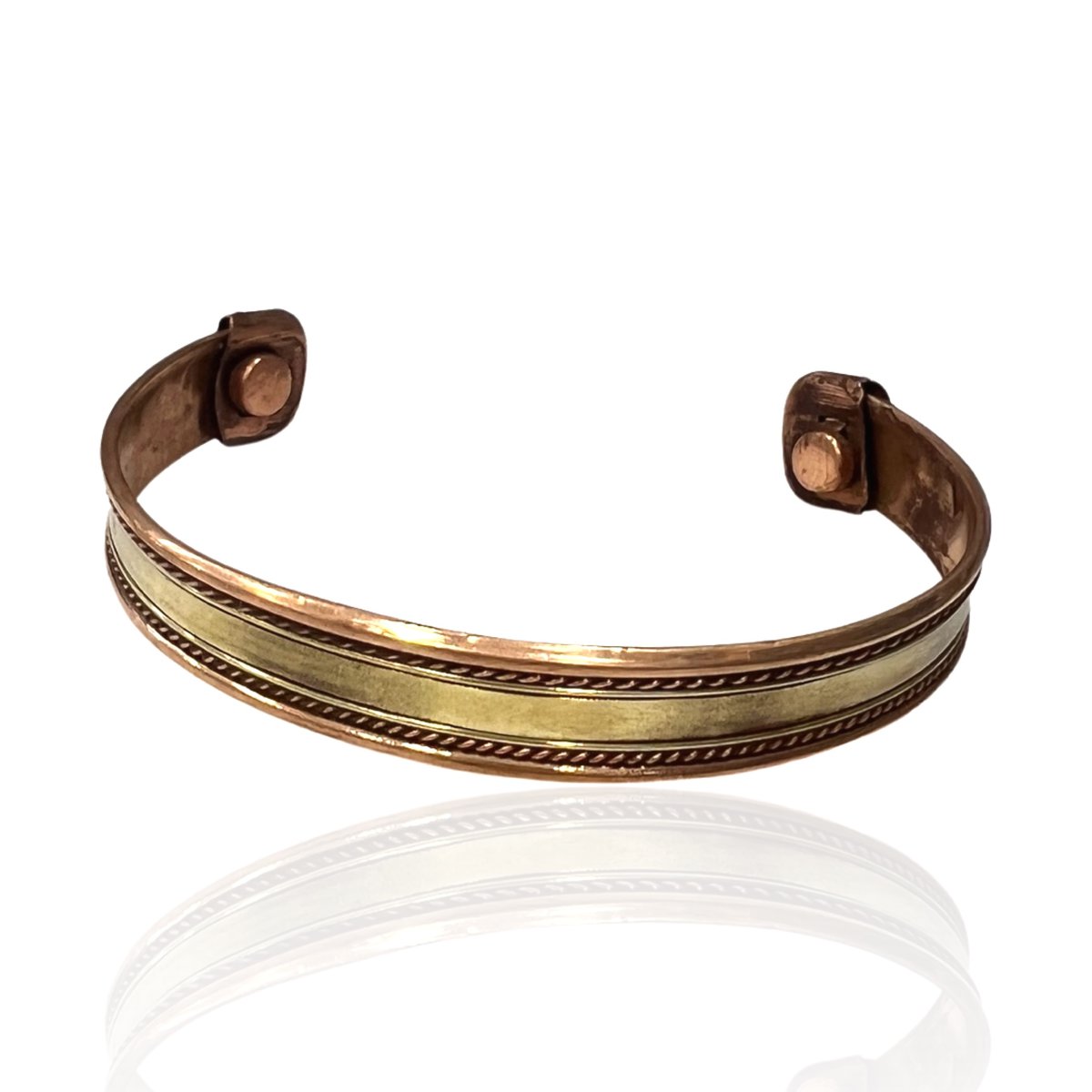 Construcția din cupru conferă o notă clasică și plăcută la atingere, iar formatul ajustabil permite adaptarea la majoritatea încheieturilor, între aproximativ 18–20 cm. Banda are lățimea de 1 cm, suficientă pentru a se evidenția singură, dar și pentru a se combina armonios cu alte brățări sau cu un ceas. Marginile netede și profilul subțire asigură confort la purtare, fie că o alegi pentru birou, plimbări sau momentele tale de relaxare.