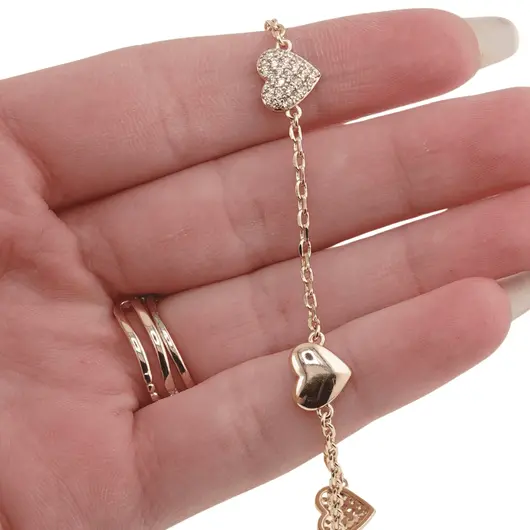Bratara din cupru placat cu aur galben 18k, model cu trei inimi si zirconiu alb.