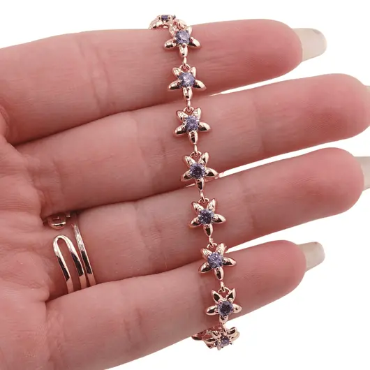 Bratara din cupru placat cu aur roz 18k, model flori cu zirconii violet.