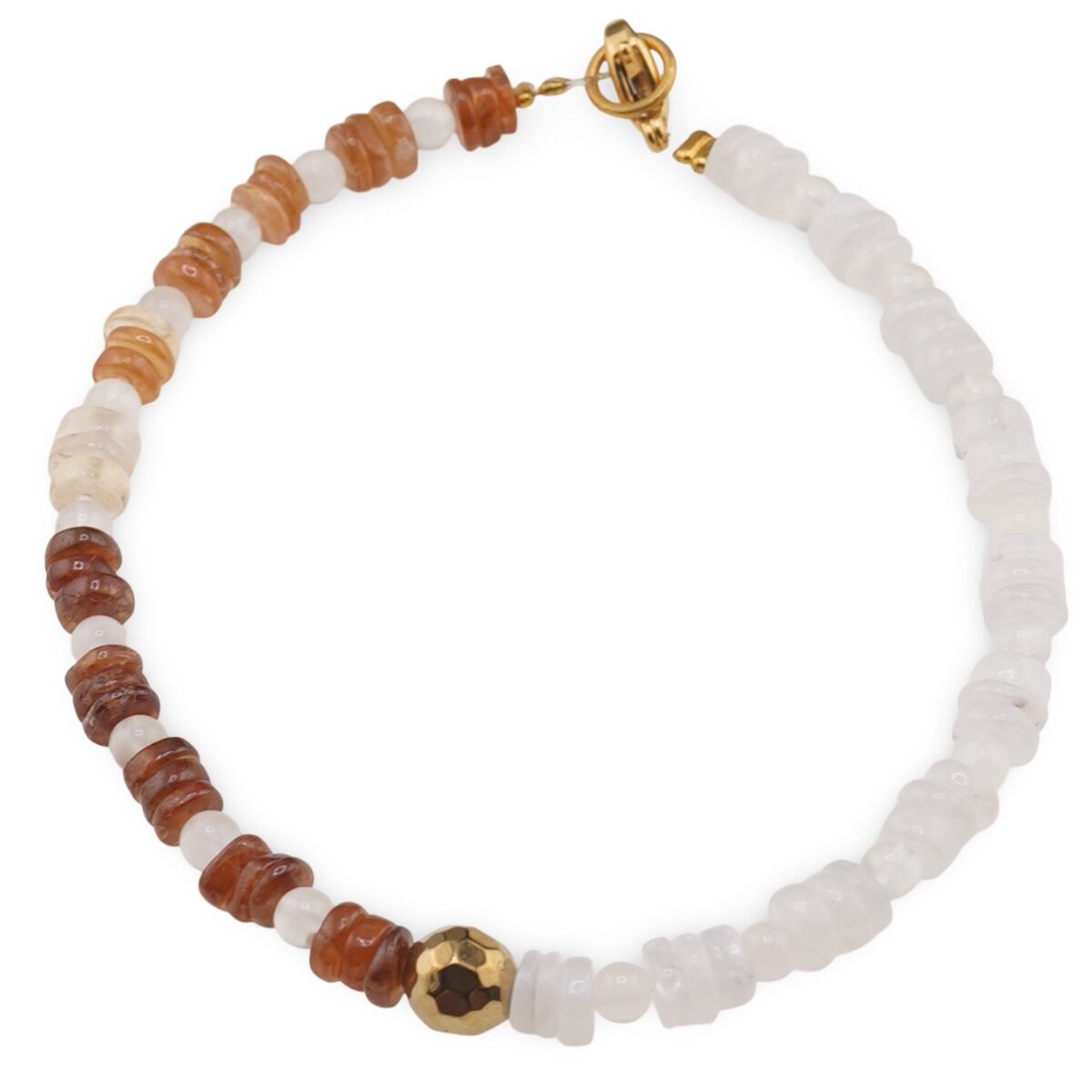 Bratara din granat Hessonit, Piatra lunii si hematit auriu este creată pentru tine dacă îți dorești mai multă stabilitate interioară, claritate și vitalitate în viața de zi cu zi. Cristalele naturale, prelucrate în rondele de 5 mm și sfere fine de 4 mm, se îmbină armonios într-un joc de nuanțe alb și maro, completate discret de strălucirea caldă a inoxului auriu.