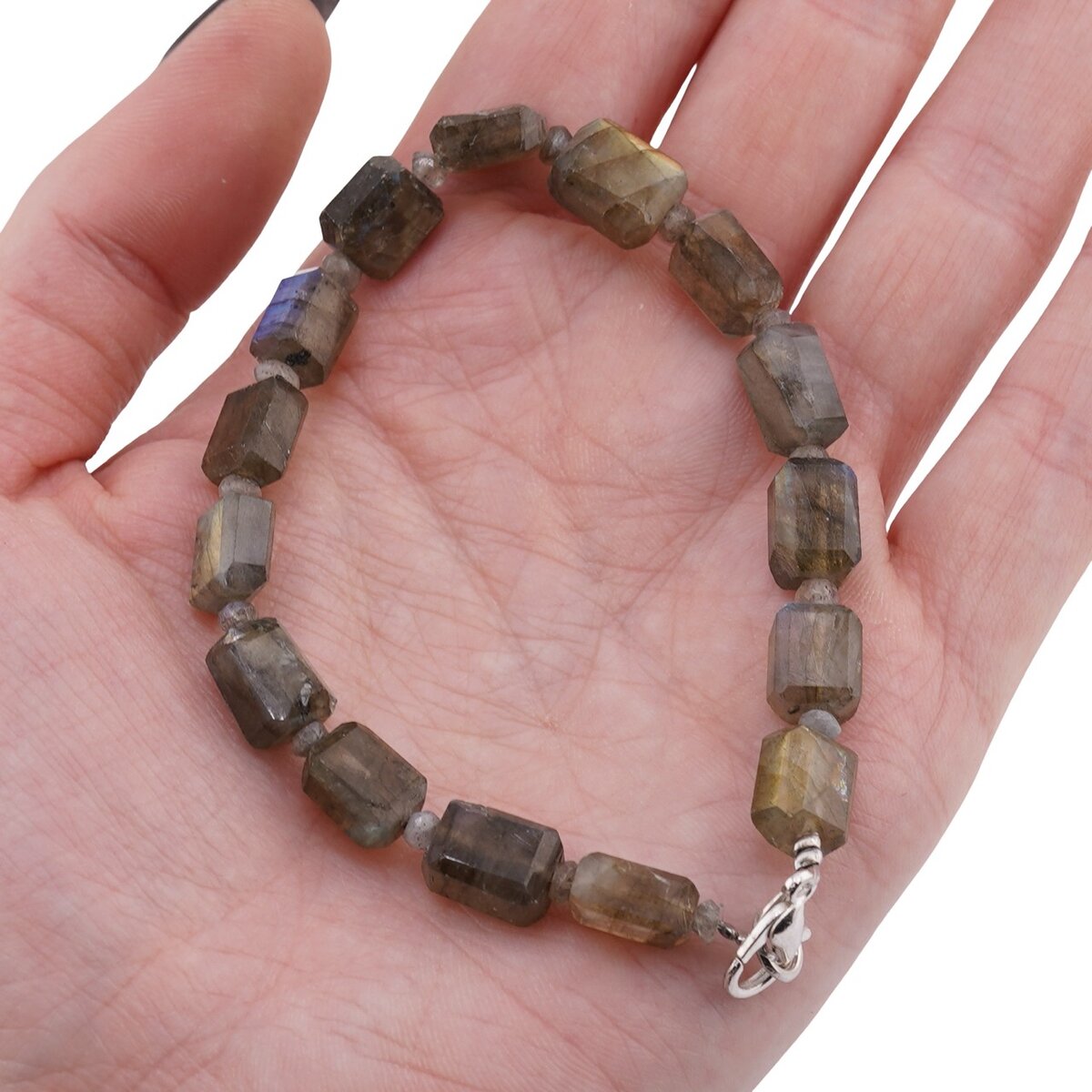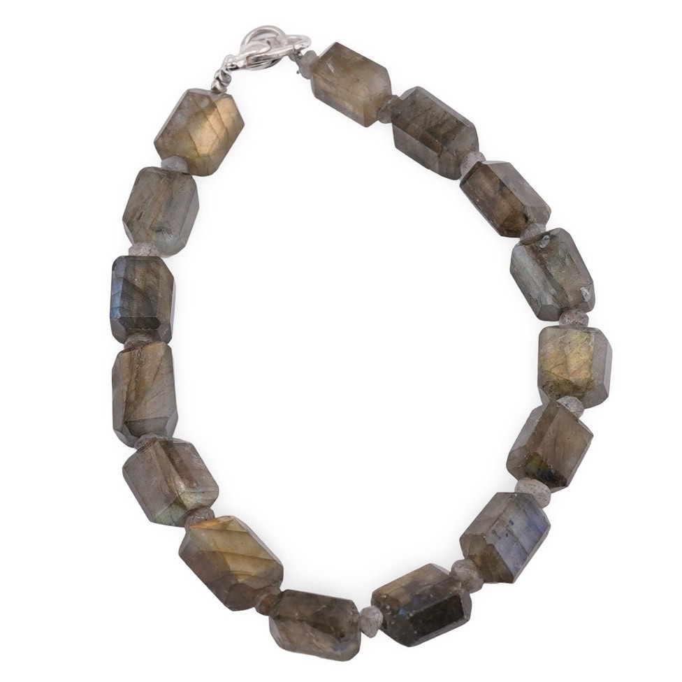 Designul fațetat captează lumina natural, astfel încât brățara se potrivește atât la ținute casual, cât și la cele elegante. Fiind un cristal cu o duritate de aproximativ 6–6,5 pe scara Mohs, labradoritul se comportă bine în purtarea de fiecare zi, cu grija obișnuită pentru bijuterii.