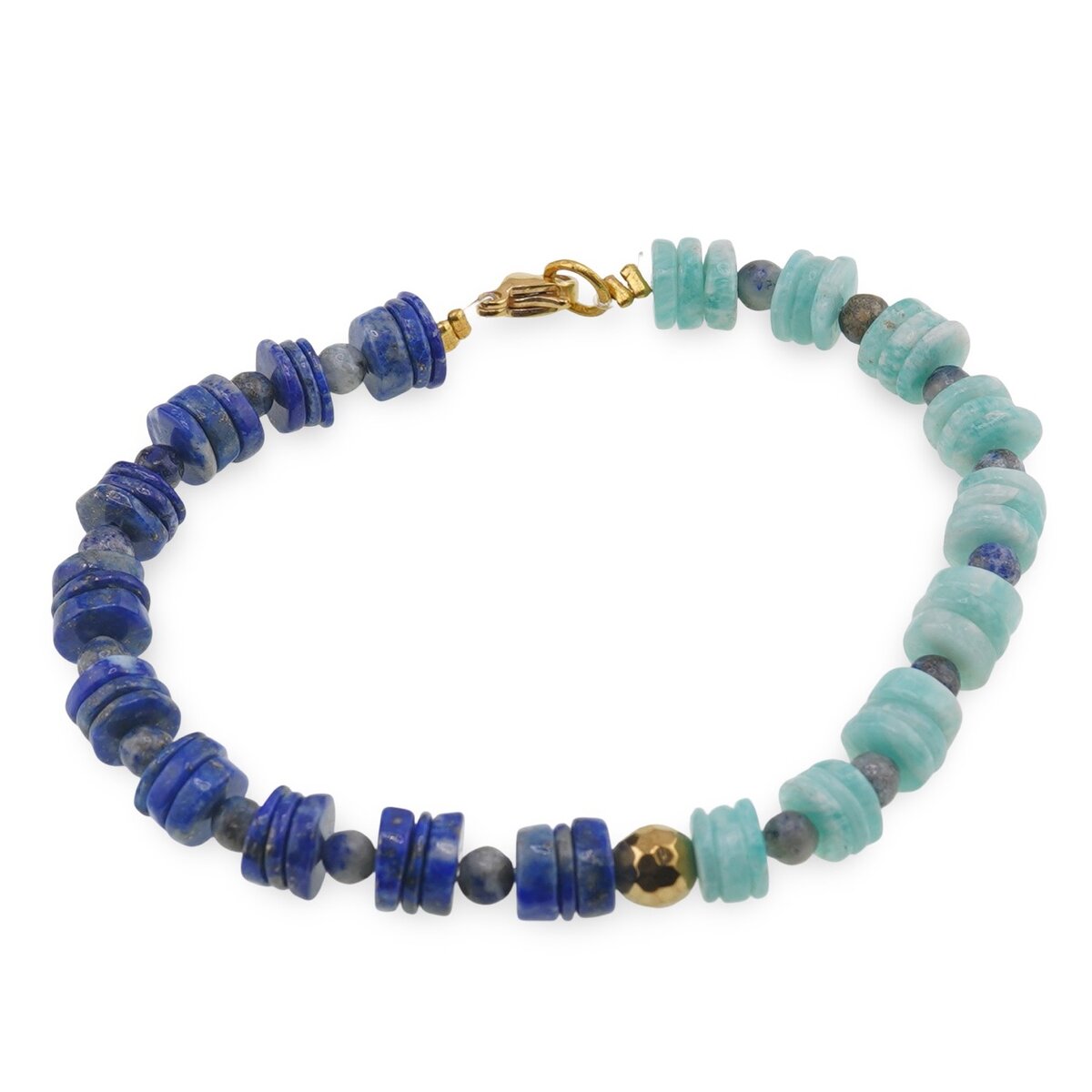 Această brățară din Lapis Lazuli, Amazonit și Hematit auriu este gândită pentru tine dacă îți dorești mai mult calm, claritate și stabilitate în viața de zi cu zi. Discurile de Amazonit de 7-8 mm se îmbină armonios cu sferele de Lapis Lazuli de 4 mm și cu accentele de Hematit fatetat de 6 mm, creând o combinație echilibrată de albastru profund și auriu cald.