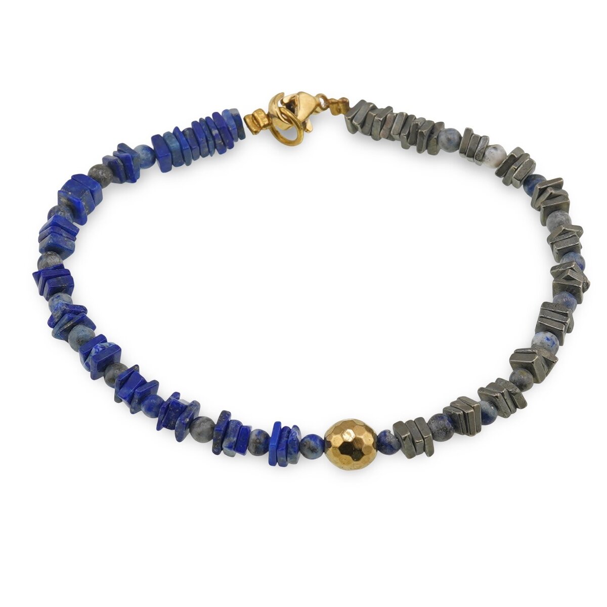 Gândită pentru echilibru și eleganță discretă, această brățară combină albastrul profund al Lapisului Lazuli cu reflexele gri-metalice ale Piritei. Designul alternează patratele fine de aproximativ 4 mm cu sfere delicate de circa 3 mm, din cristale naturale 100%, pentru un aspect rafinat și ușor de purtat zi de zi.