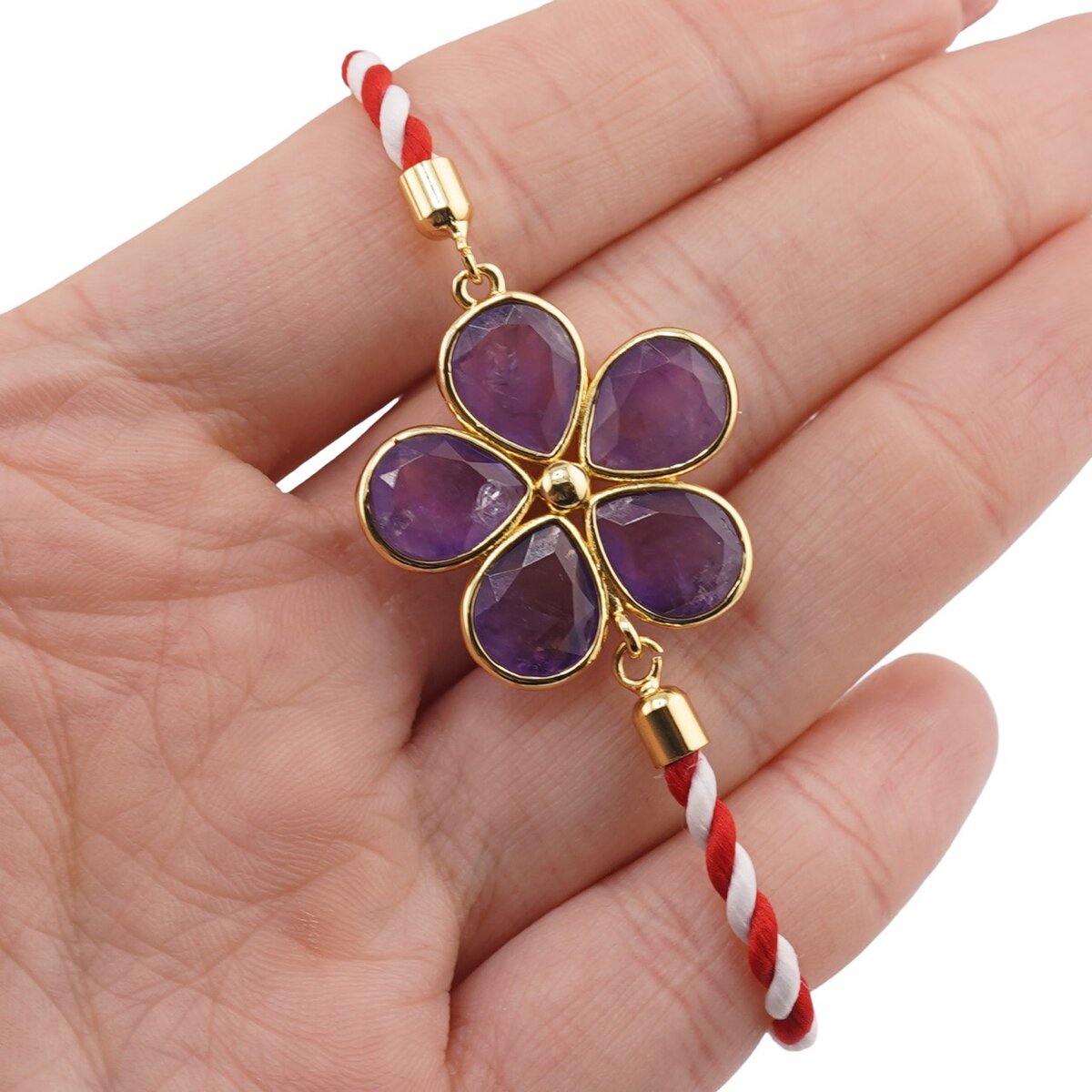 Bratara Martisor cu Ametist si montura aurie floare este gândită pentru tine dacă vrei să aduci mai mult calm, claritate și echilibru în fiecare zi. În centrul ei se află un cristal natural de ametist, fin fațetat, așezat într-o montură aurie în formă de floare, care îi pune discret în valoare nuanțele de mov. Șnurul reglabil, în tonuri de alb și roșu inspirate de mărțișor, îți permite să o ajustezi ușor pe încheietură, astfel încât să fie comodă și plăcută la purtat.