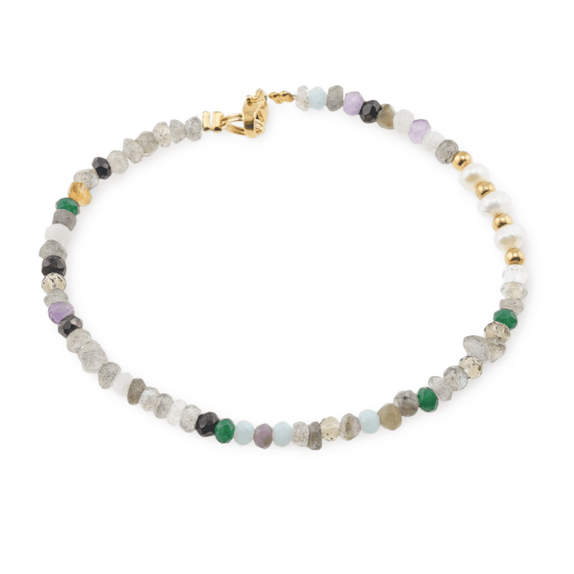 Realizată din mix de pietre semiprețioase și perle de cultură (cunoscute și ca Carbonat de calciu organic, Cultured Pearl), brățara propune un echilibru între naturalețe și rafinament. Elementele de 3-4mm, tăiate în discuri fațetate, aduc un luciu discret, în timp ce perlele turtite adaugă o notă organică. Este aleasă adesea de cei care își doresc stări de calm și relaxare și care caută susținere pentru armonie emoțională și spirituală. Perla este tradițional asociată cu Chakra inimii (Anahata), cu Luna și elementul Apă, iar pentru cei născuți în luna iunie sau care prețuiesc energia zilei de marți, poate deveni o piesă cu semnificație personală.