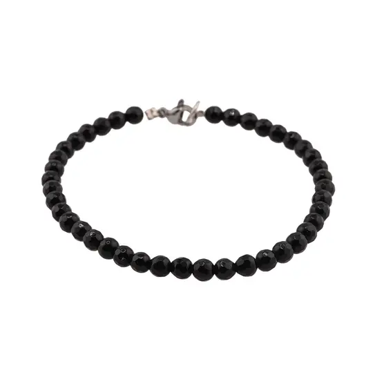 Brățara este creată din onix (onyx), o varietate de calcedonie stratificată cunoscută pentru profunzimea culorii și luciul fin al fațetelor. Mărgelele sunt montate pe fir special pentru bijuterii, rezistent, iar închiderea se poate alege între metal rodiat sau argint 925, în funcție de preferință. Lungimea este personalizabilă, în intervalul 17–21 cm, pentru o potrivire confortabilă. Piatra are o duritate de 6.5–7 pe scara Mohs, ceea ce o face potrivită pentru purtare frecventă.