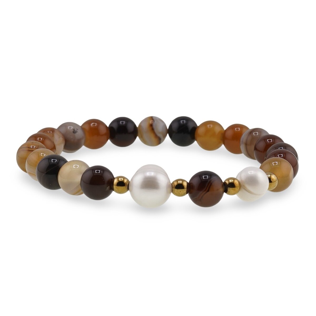 Perlele de cultură (cunoscute și ca Cultured Pearl), un carbonat de calciu organic, sunt asociate cu Luna și cu elementul Apă, aducând o vibrație blândă de calm și relaxare. Alături de agatul maro, apreciat pentru stabilitate și ancorare, brățara susține echilibrul emoțional și spiritual și poate facilita procesele de vindecare emoțională. Energia sa se armonizează cu Chakra Inimii (Anahata), invitând la deschidere, acceptare și o relație mai caldă cu tine însuți și cu cei dragi.