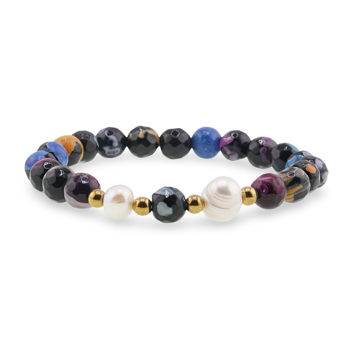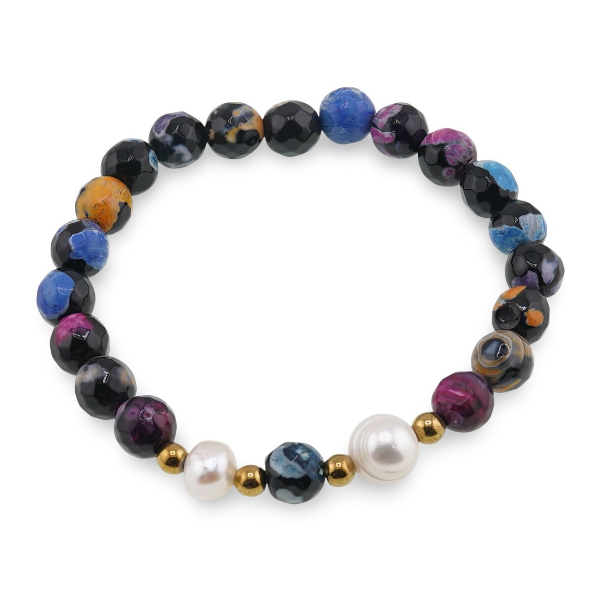 Bratara pe elastic Perle de cultura, bumbi aurii si Agat multicolor patat sfere fatetate 8mm