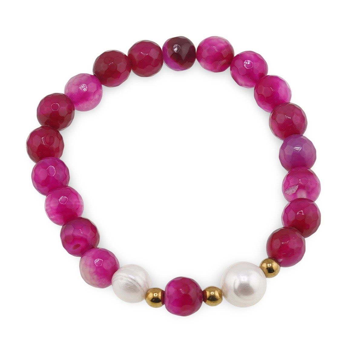 Delicată și armonioasă, această brățară pe elastic îmbină strălucirea perlelor de cultură cu accente calde de bumbi aurii și vibrația blândă a agatelor roz fațetate de 8 mm. Contrastul dintre alb, auriu și roz creează un ritm plăcut la încheietură, potrivit pentru ținute casual sau momentele în care vrei un plus de rafinament fără efort.